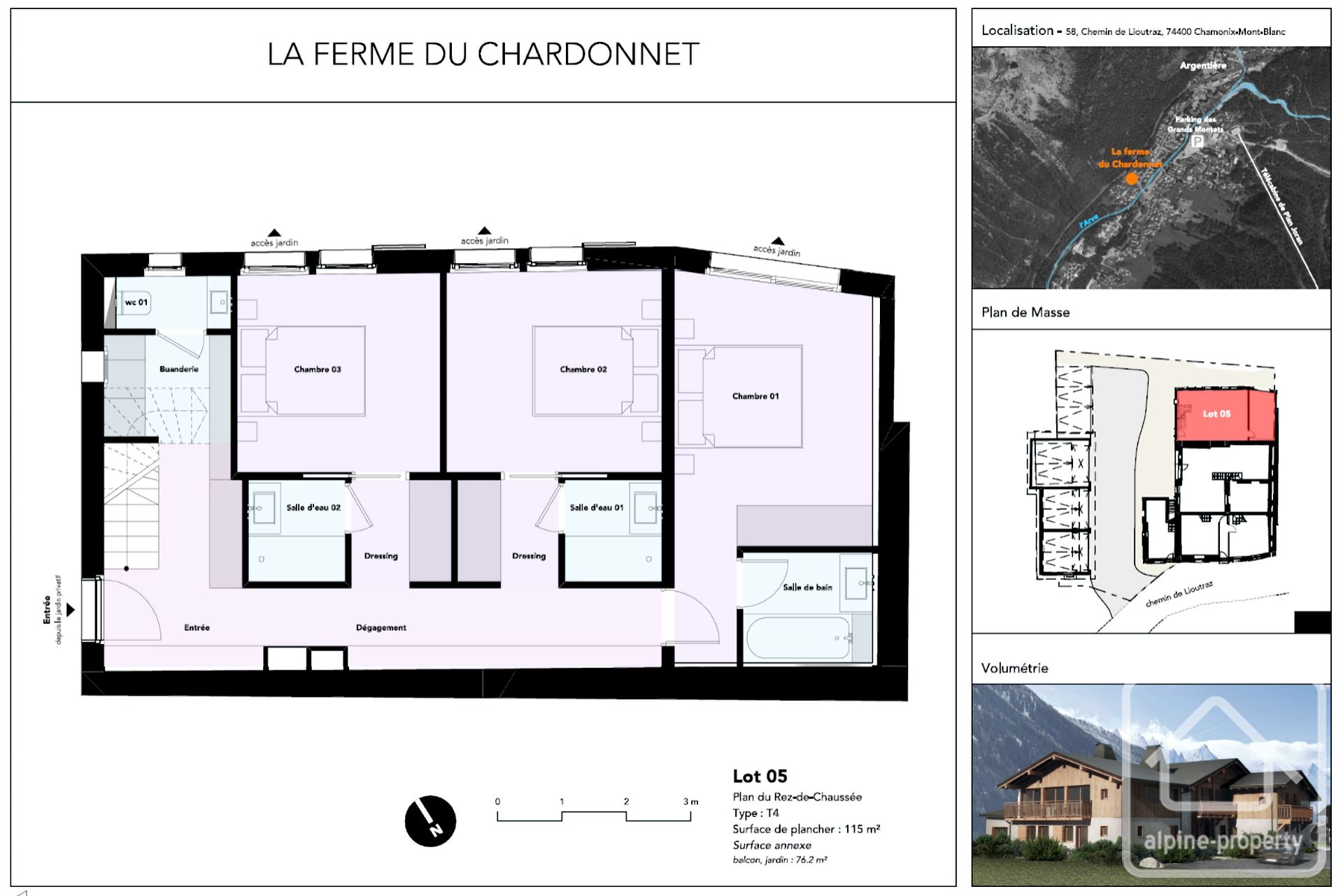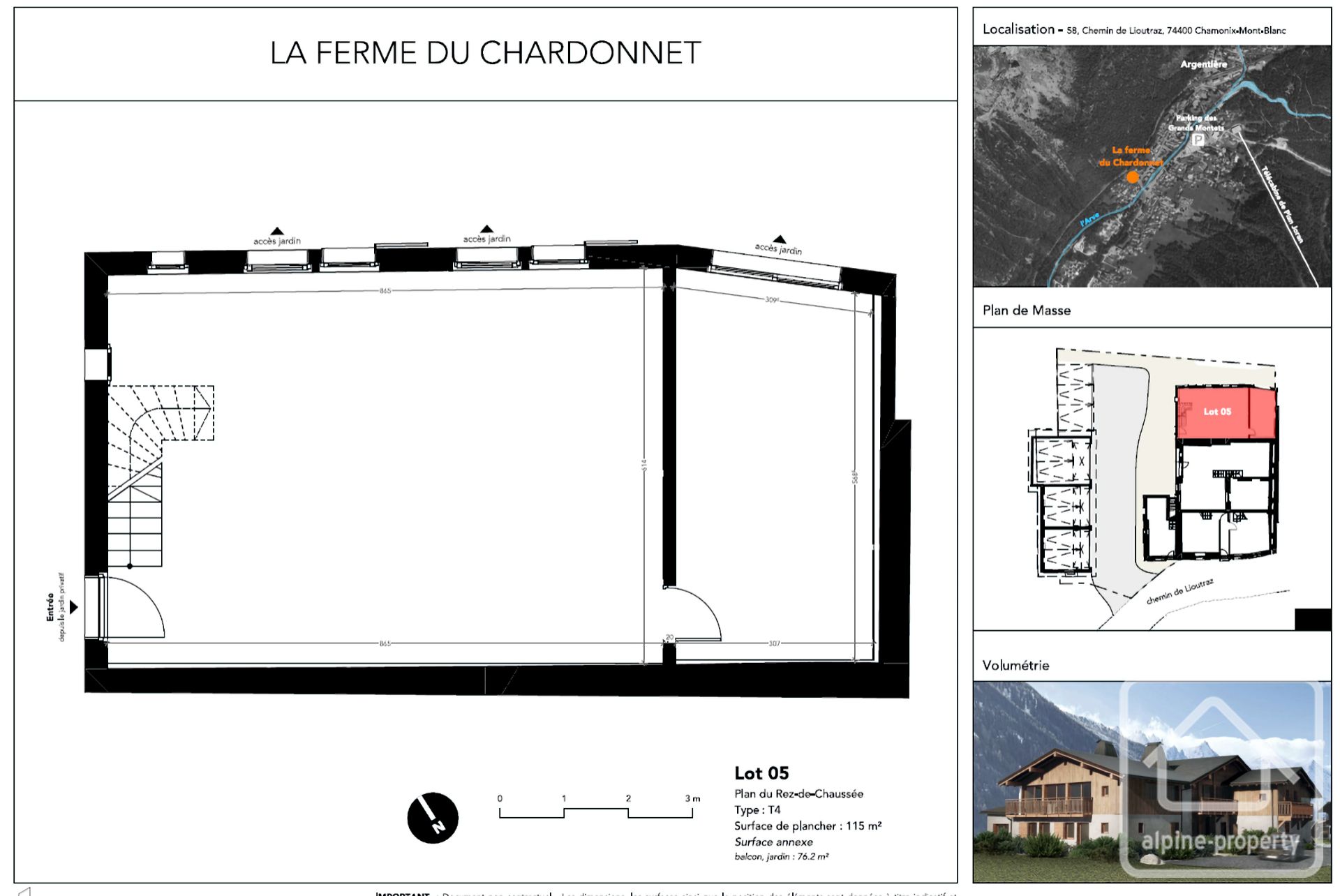 Spacious three bedroom shell apartment in Argentière with private garden, balcony and wooden terrace, steps from Grands Montets ski lifts, 15 minutes from the Swiss border and 1h15 from Geneva airport.