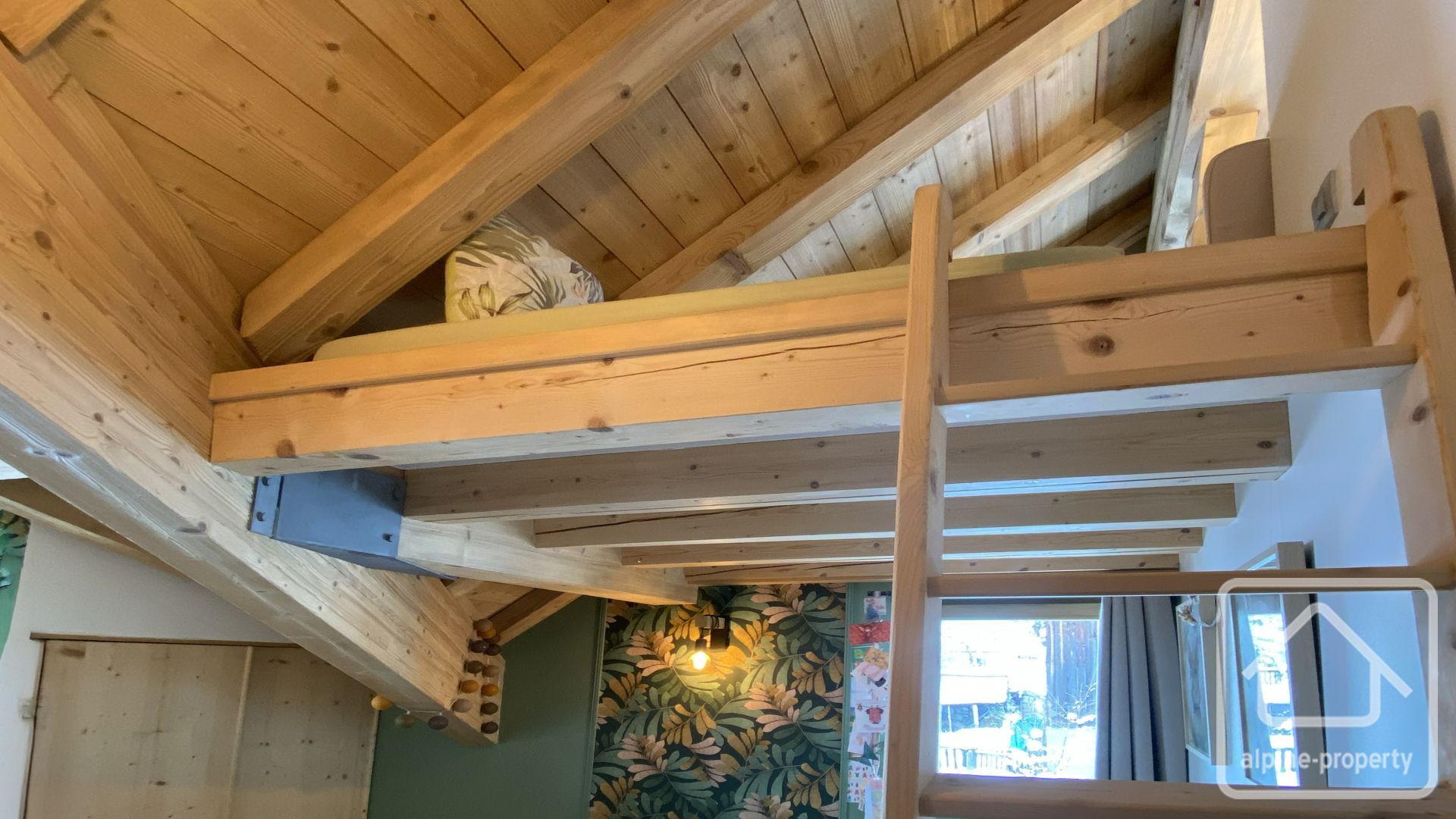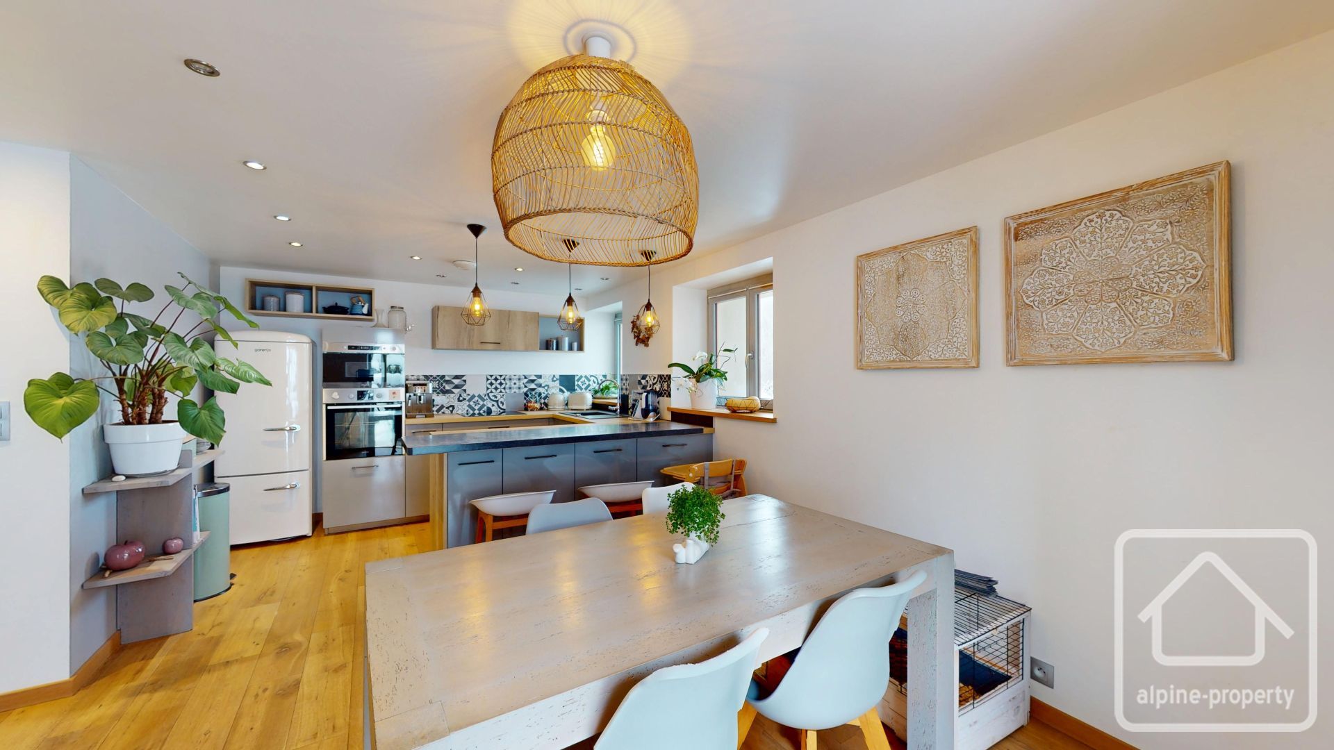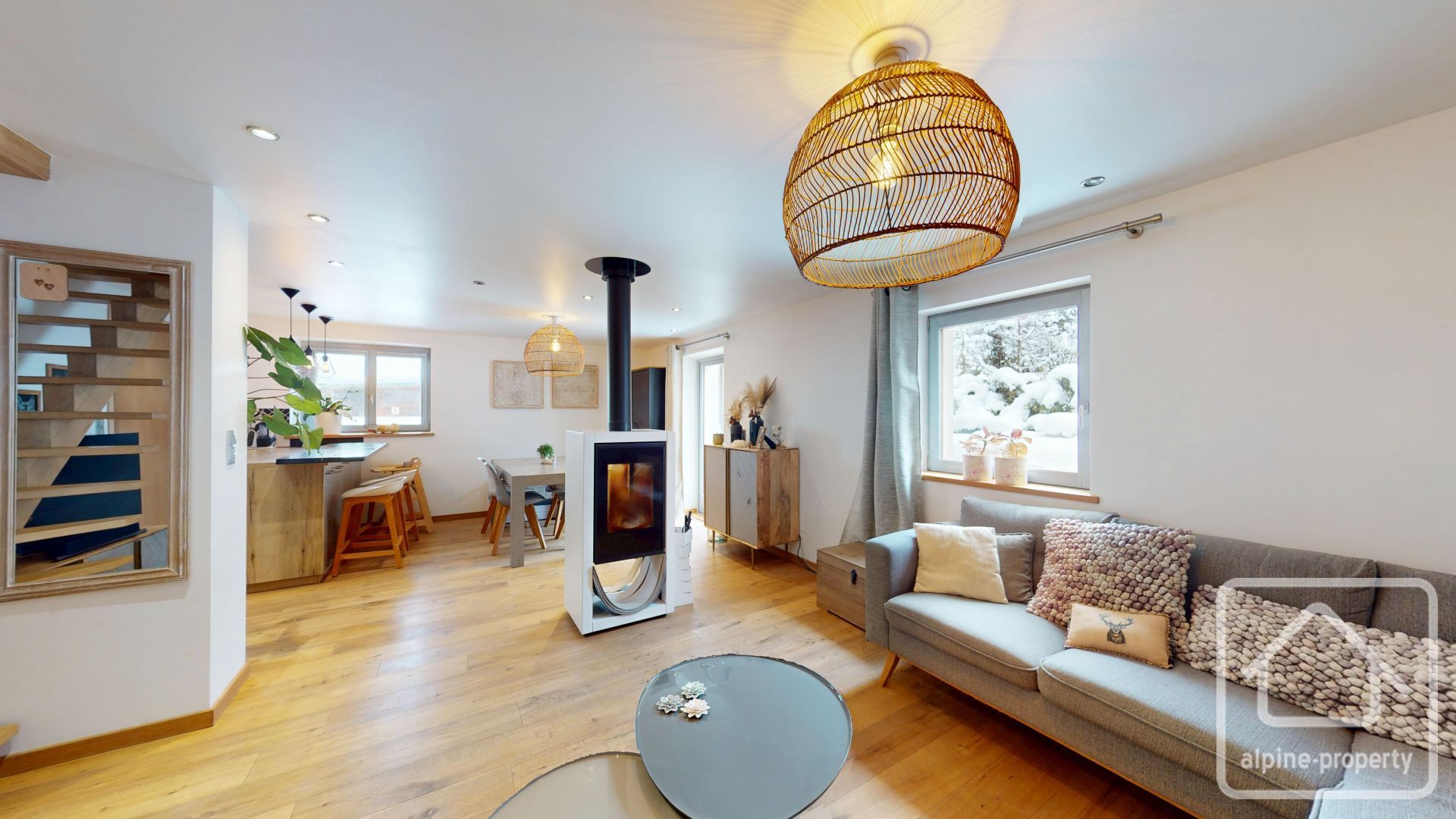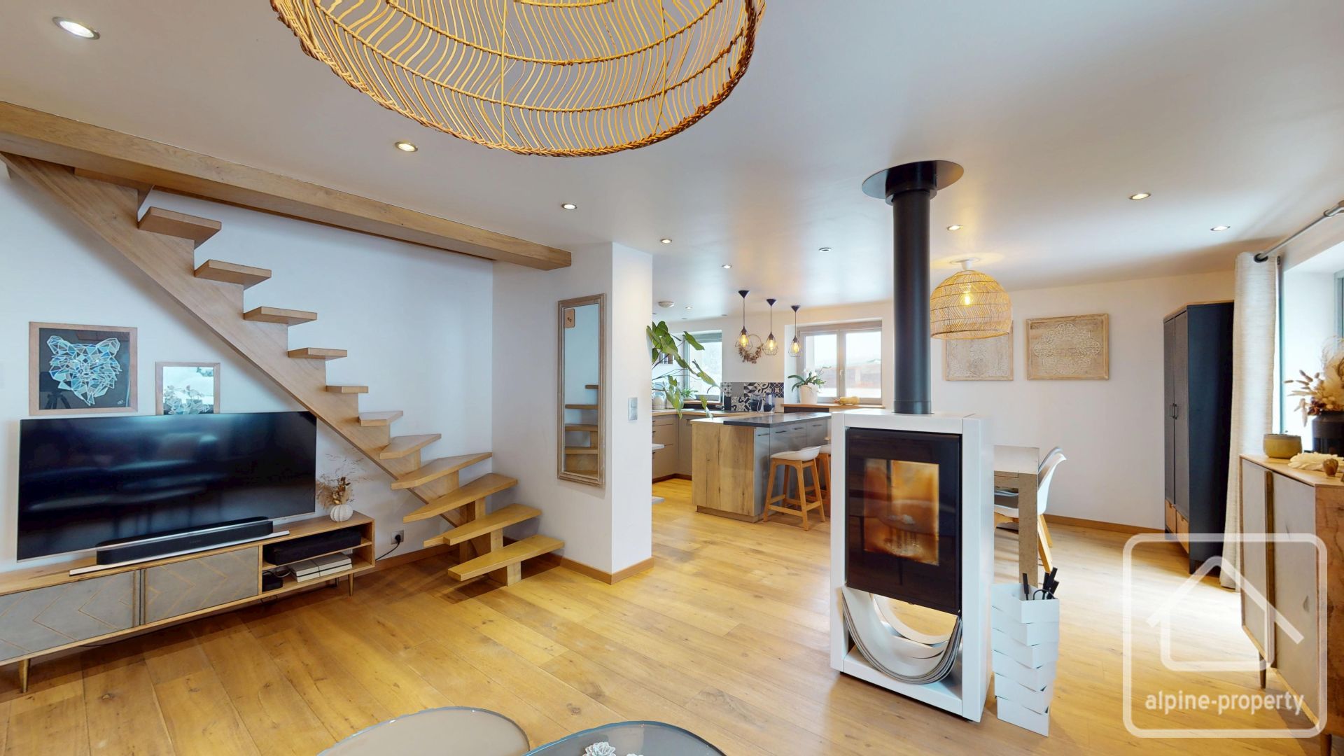 The property was sold as a shell in 2017, and the interior had a full refit including all wiring, plumbing and layout in 2018, giving it a light and contemporary feel to a high standard. The open-plan living area and 49m2 south-facing private terrace are a huge attraction, and the high ceilings with exposed wooden frameworks on the upper level combine alpine charm with modern design.