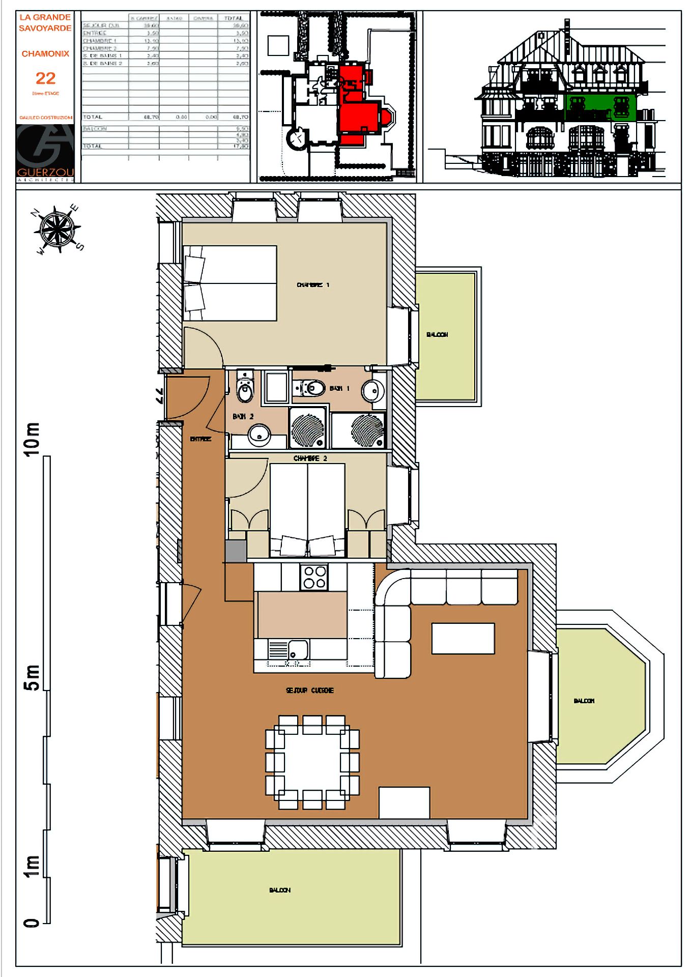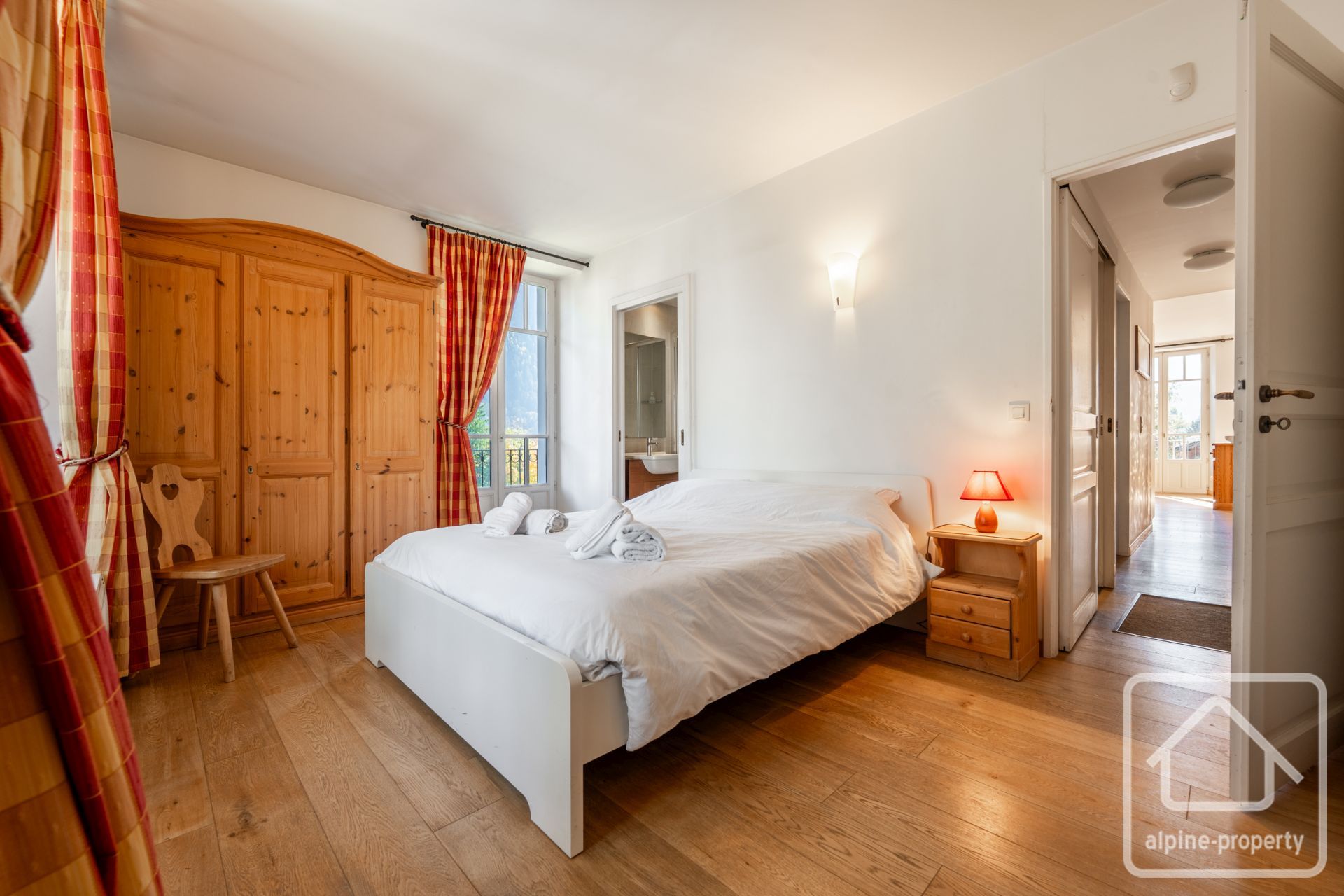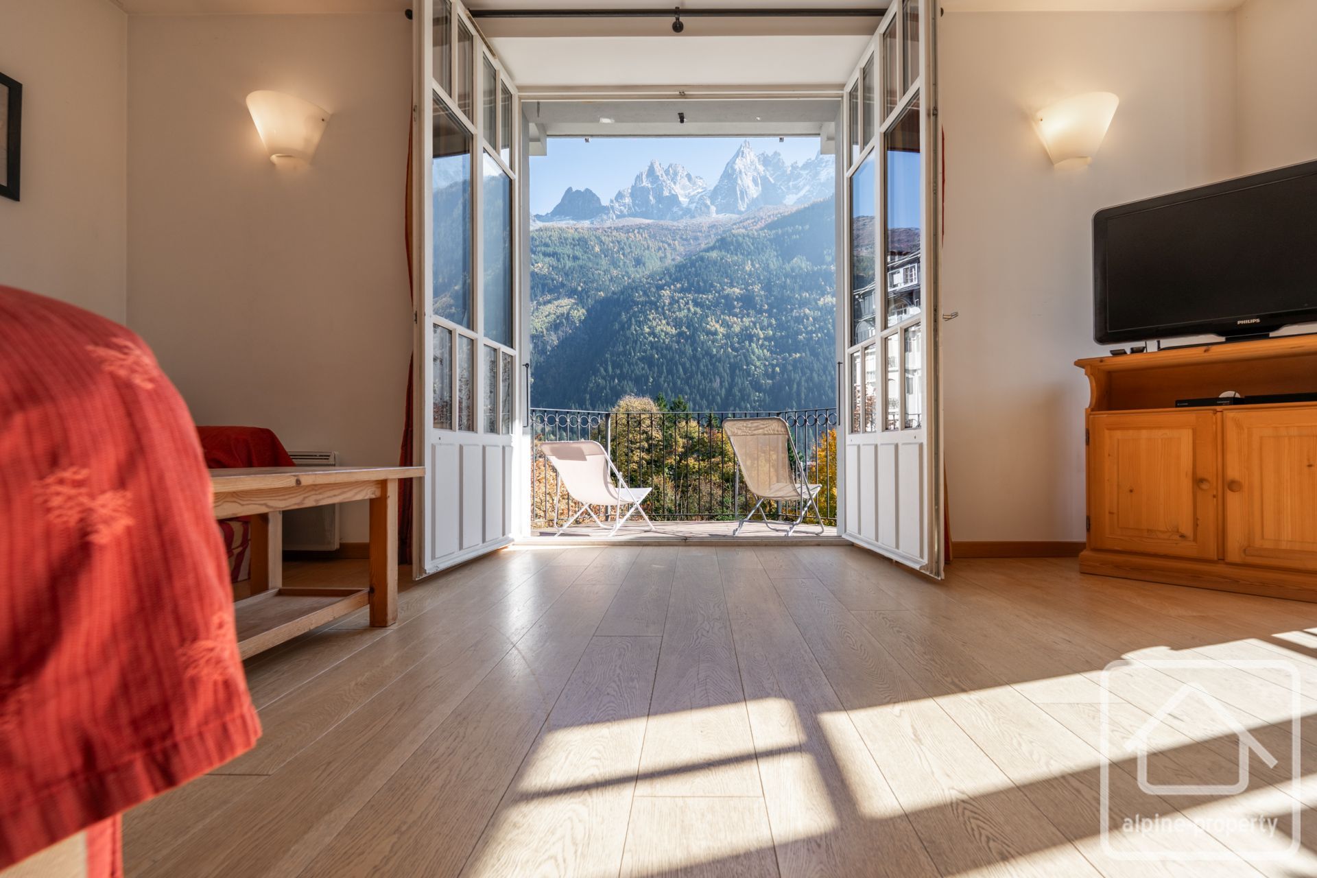Apartment 6 is located on the second floor and enjoys stunning dual orientation. Two large balconies off the spacious open plan living area facing south-east and south-west look directly at the snowy peaks of the Mont Blanc and a further balcony off the bedroom also straight at the Mont Blanc.