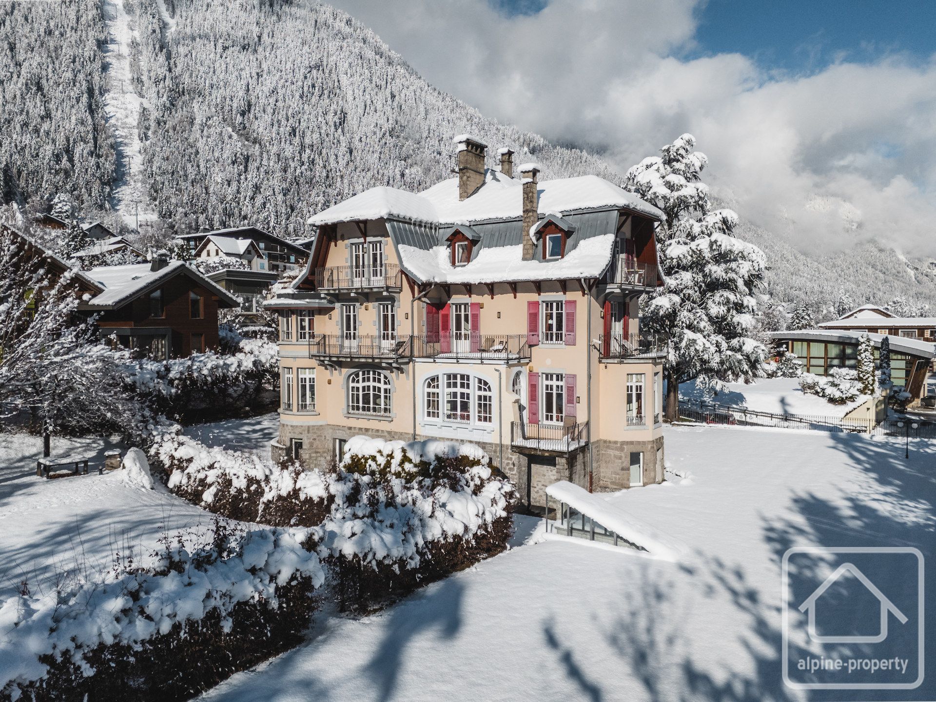 Located in an iconic villa designed by Fleury Raillon in 1926, these elegant two and three bedroom apartments combine historic charm with modern comfort. Filled with natural light from large bay windows and high ceilings, each apartment offers stunning views of the Mont Blanc and Brévent massifs.