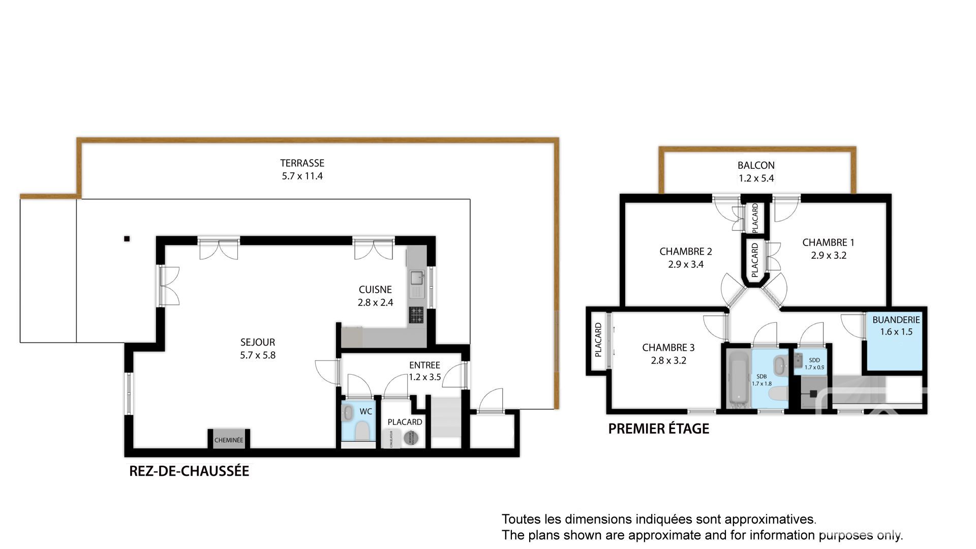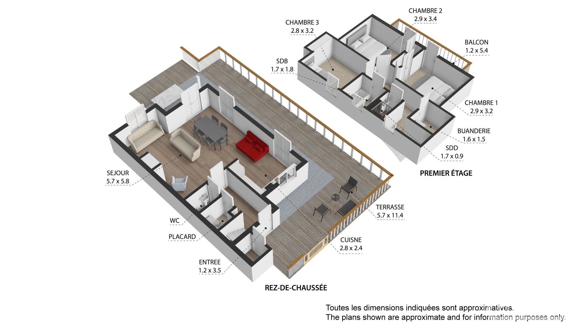 On the first floor, three bedrooms (two with balconies, all with built-in storage), bathroom with WC, shower room, storage room with washing machine.