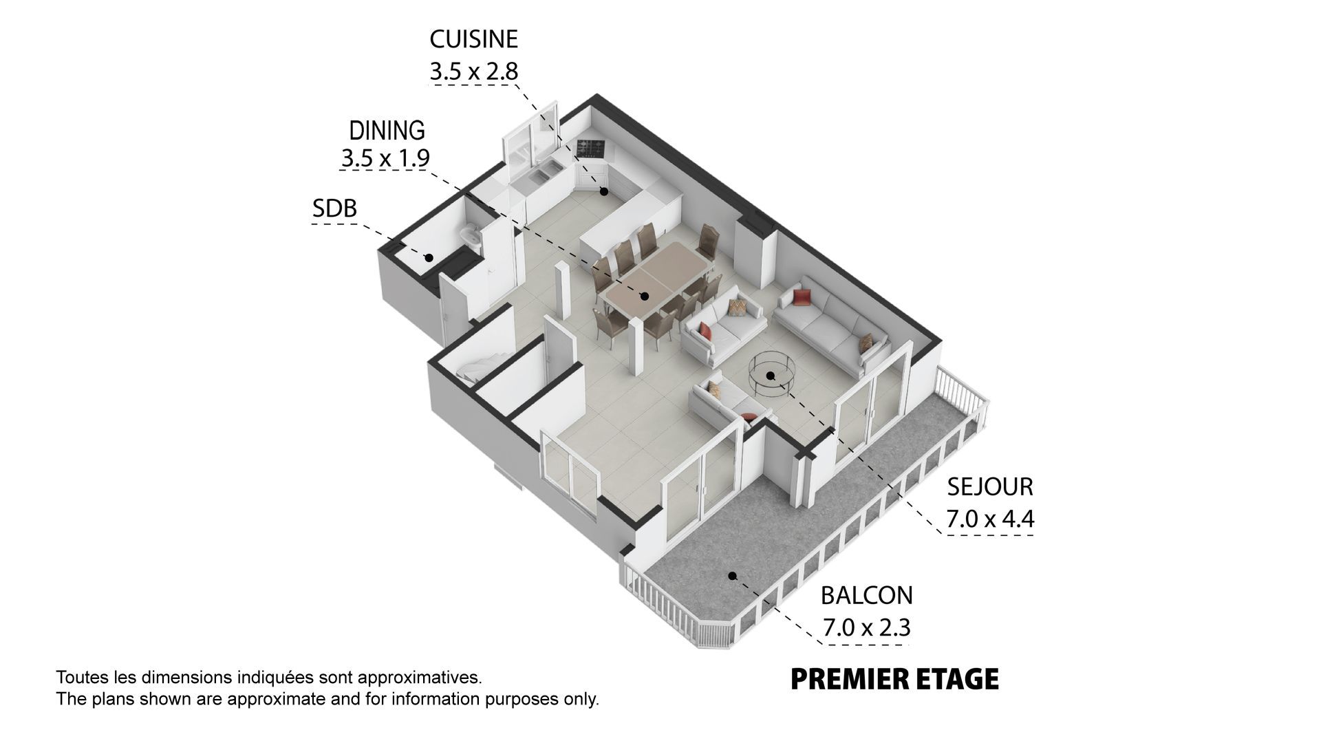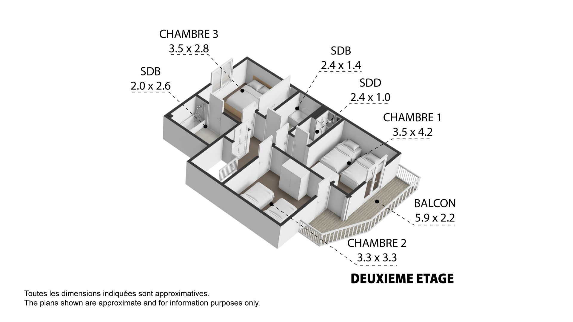 On the upper floor: Three double bedrooms (two with balcony, two with en suite bathroom) plus family bathroom.