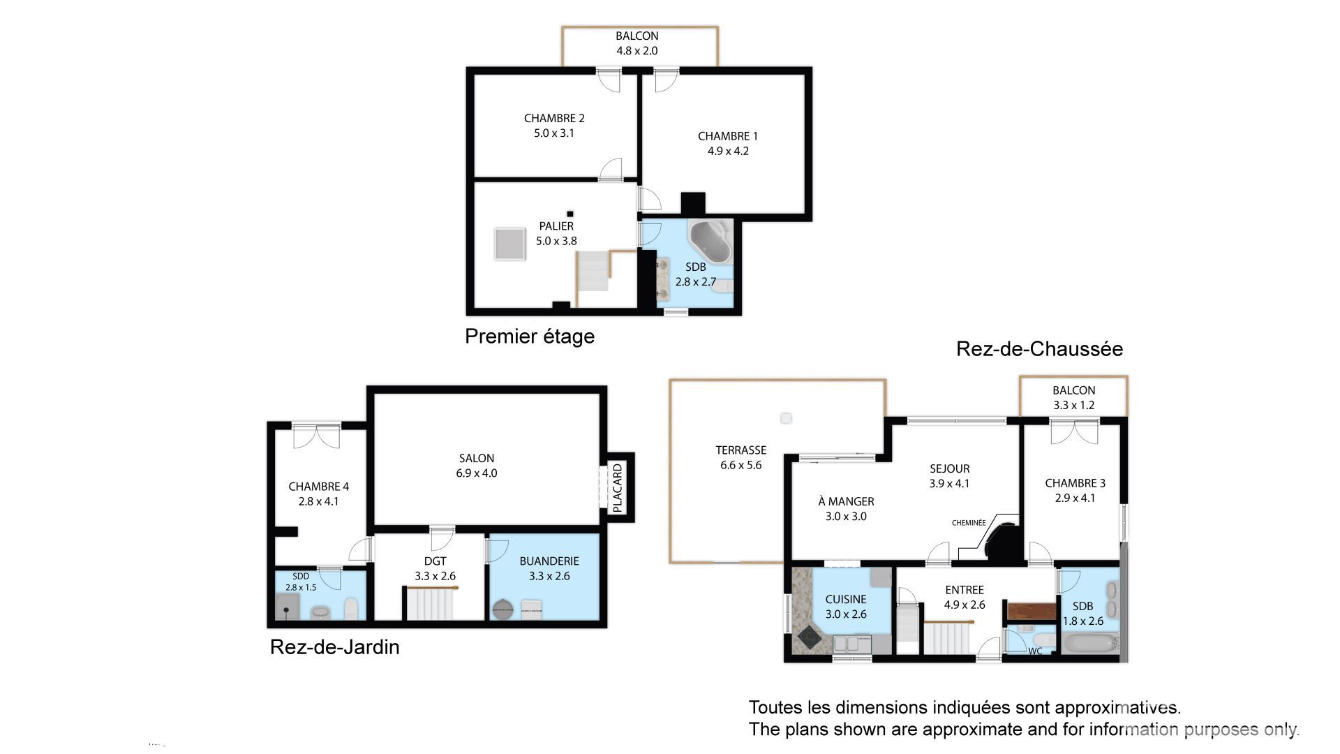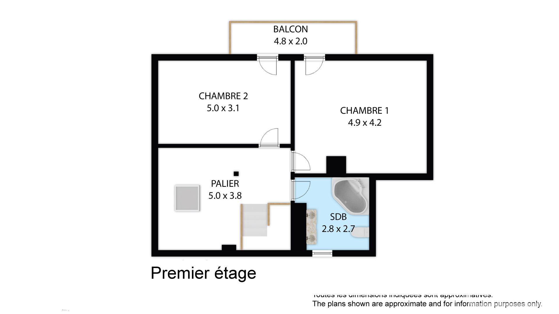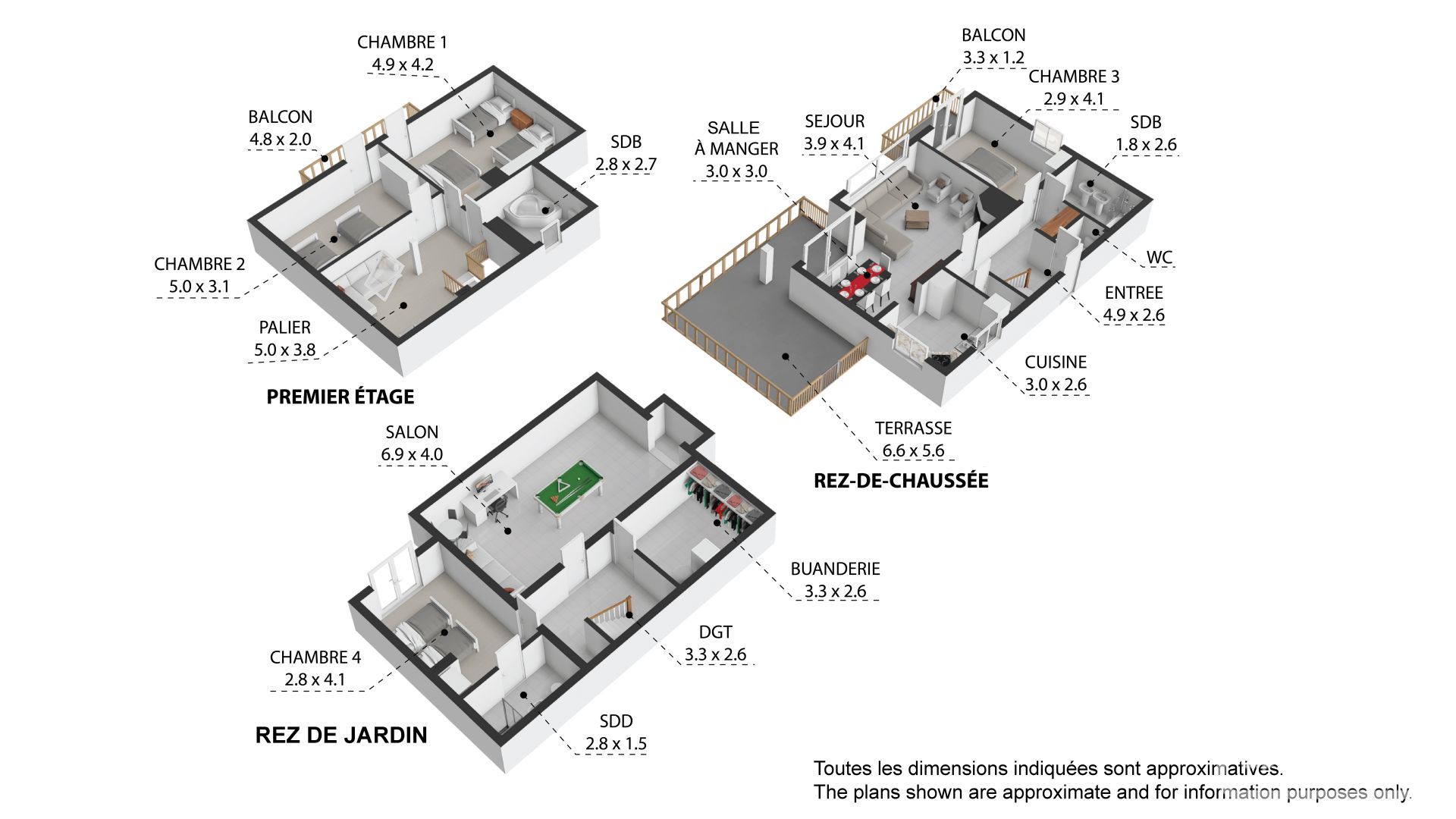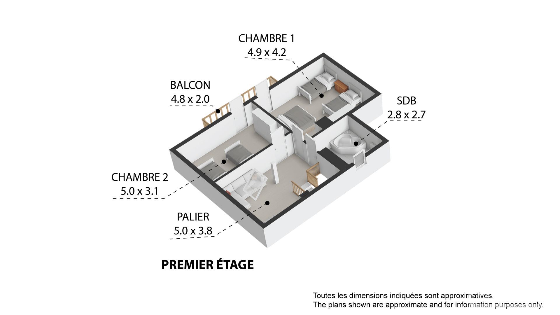 - On the first floor: two spacious bedrooms with balcony, a mezzanine area which can be used for extra sleeping space, a family bathroom.