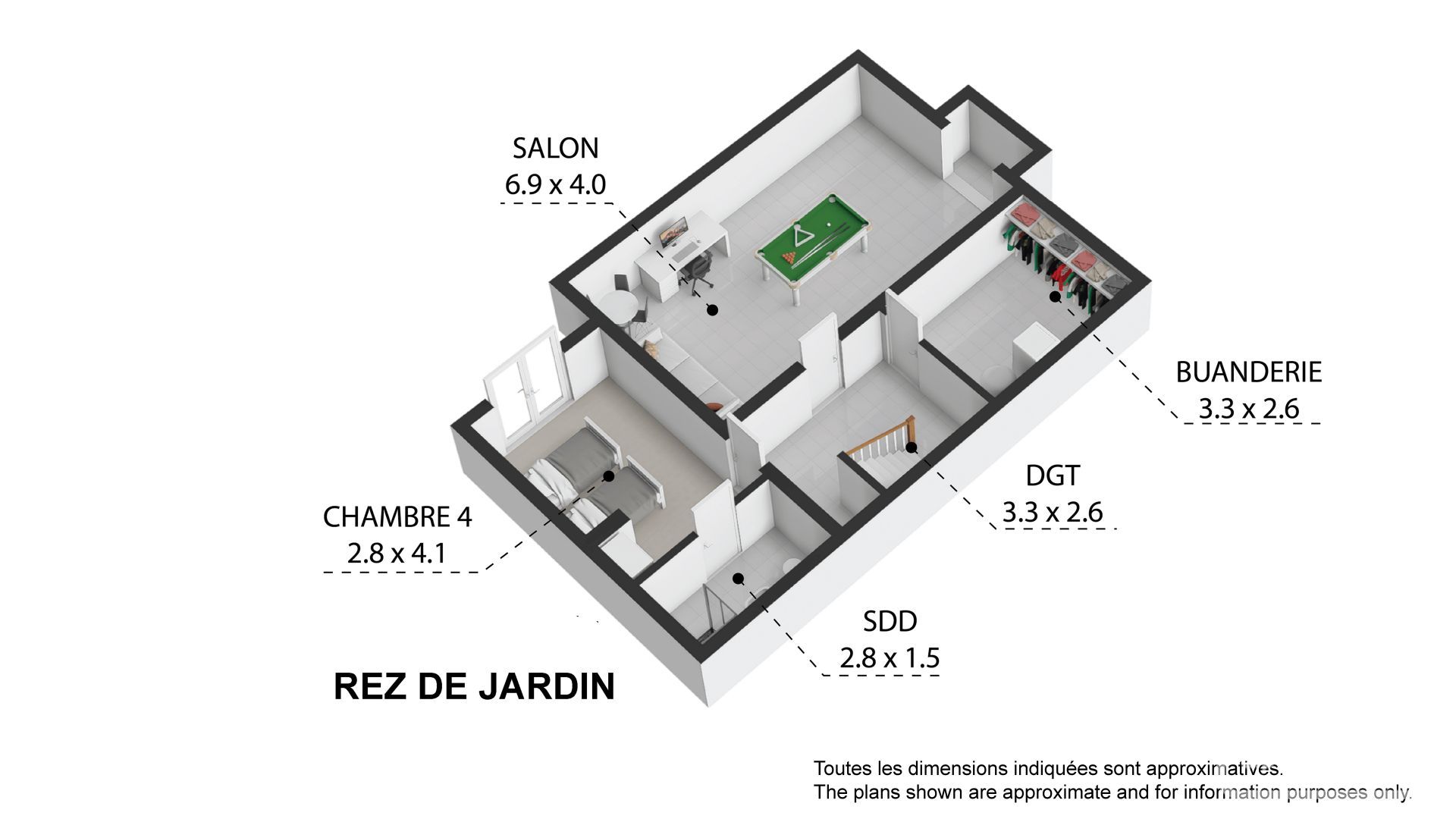 - On the lower ground floor: Double bedroom with ensuite bathroom, laundry/technical room, original garage (which is used as a second living room/games room), and an external garage with electric door.