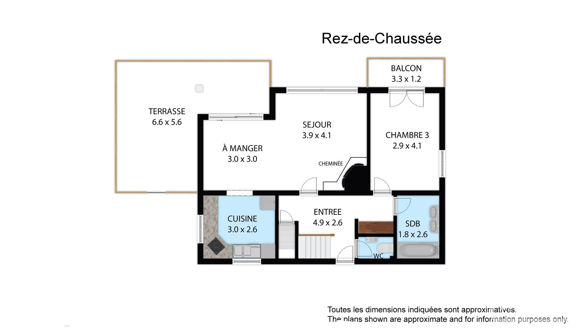 - On the ground floor: Kitchen and open plan living/dining room with fireplace (with access to large terrace), bedroom with private balcony, bathroom, separate guest WC, entrance hall with storage.
