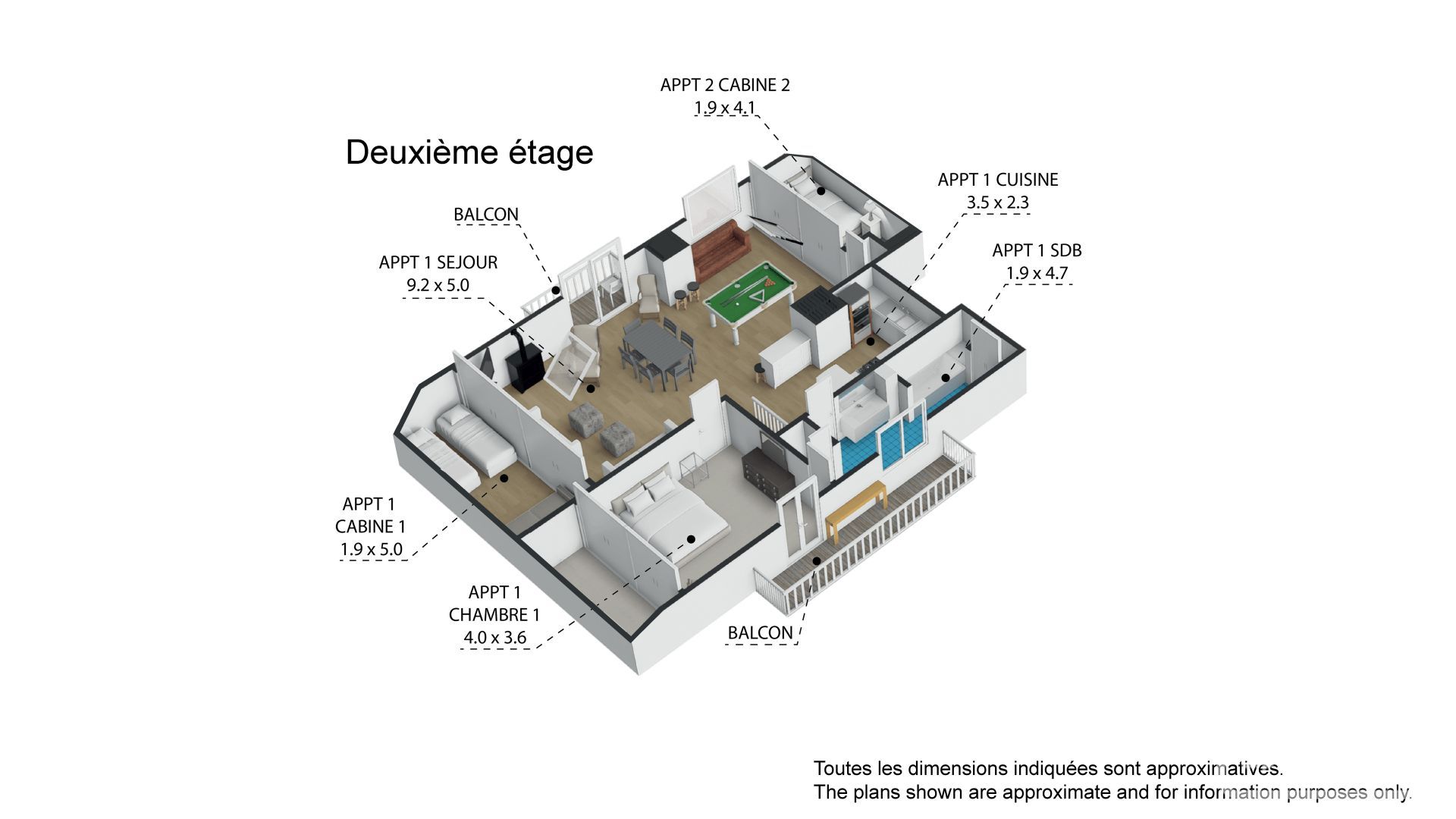 Top floor: Fitted kitchen open to a spacious living/dining room with wood-burning stove, one double bedroom, family bathroom, two coin montagne sleeping areas under the eaves, balcony. This floor has potential as a holiday let.