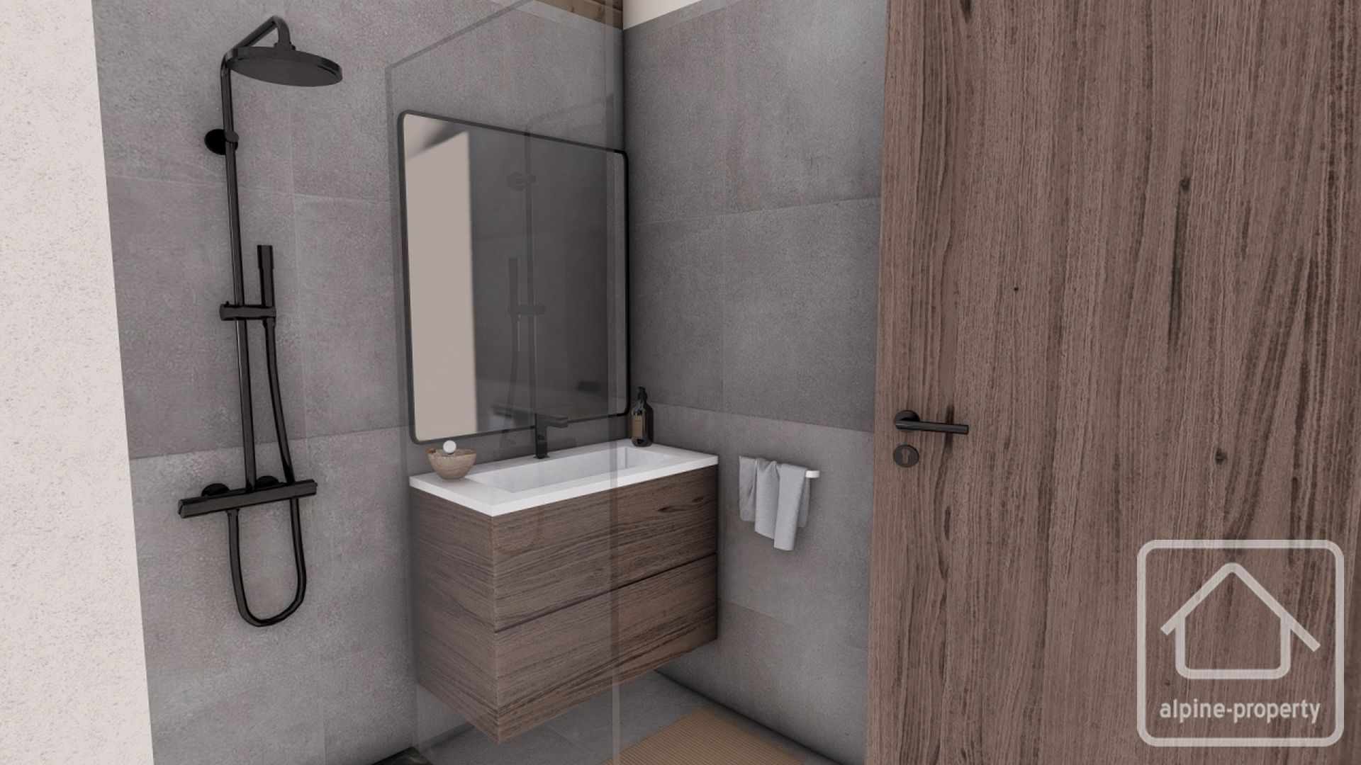 The property features three bedrooms, including a master suite with private shower room, plus an additional bathroom ideal for family living. The open-plan living area extends onto an 11 m² terrace and a private 459 m² garden, perfect for outdoor relaxation with a mountain backdrop.