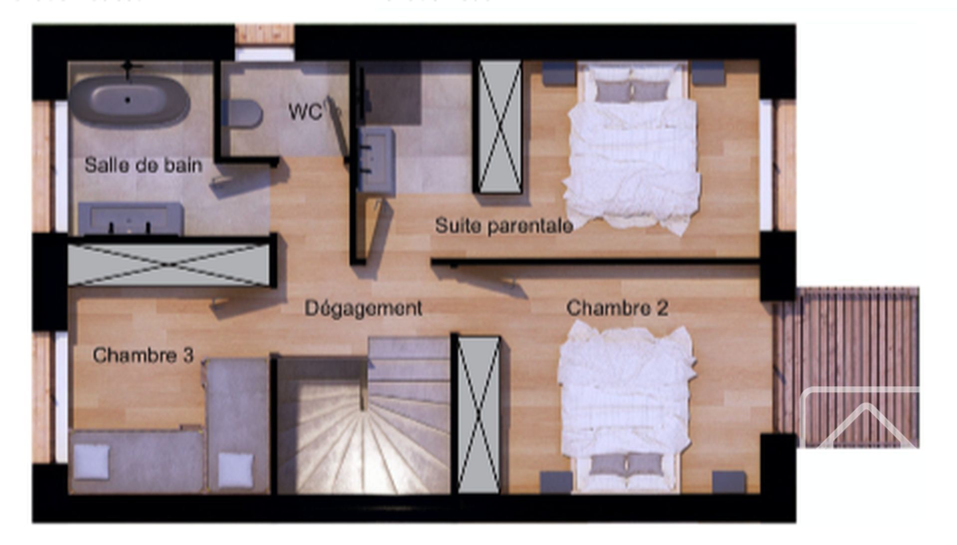 Configured across two levels, the total surface area is 108m2, plus a south-facing terrace and balcony.