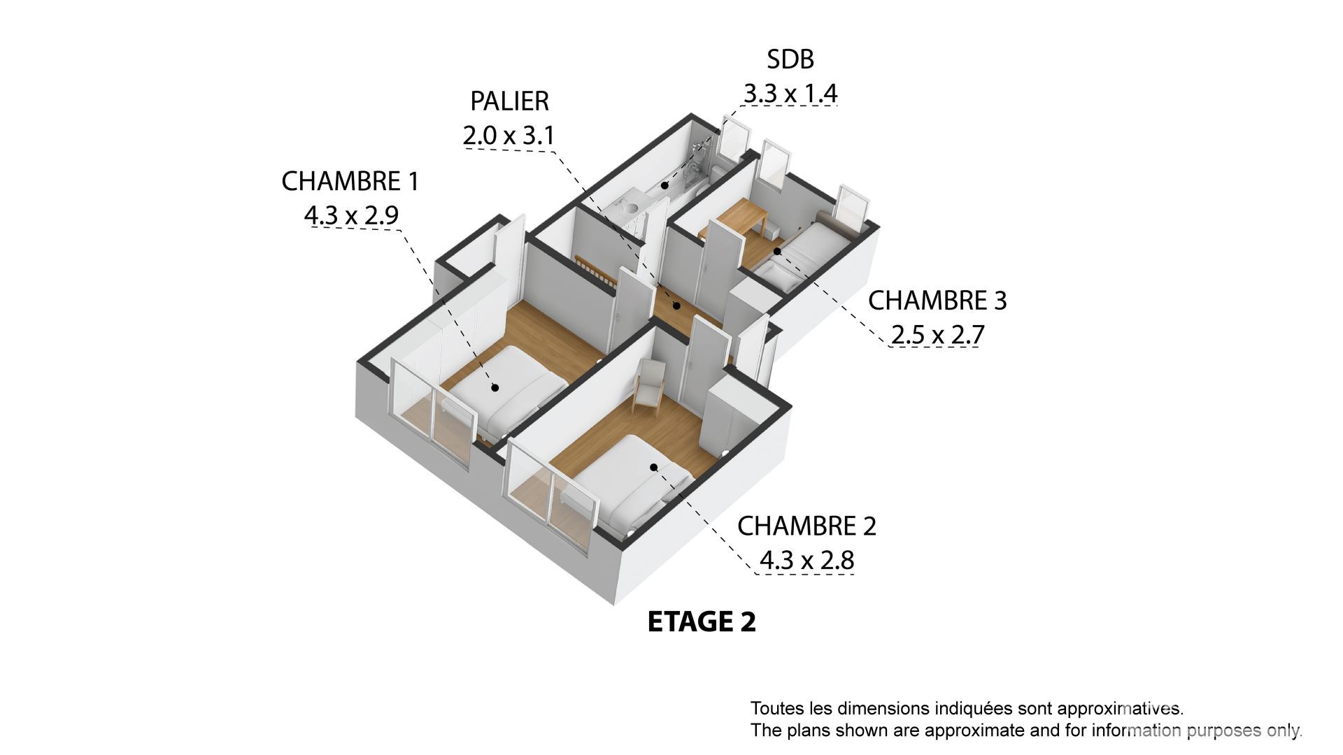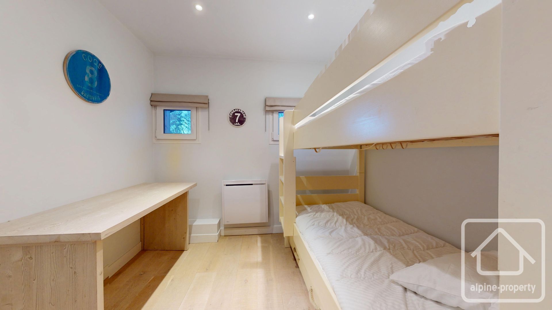 • Upper floor: The sleeping area comprises two generous bedrooms with built-in wardrobes, a cabin-style bedroom with bunk beds, and a separate bathroom with WC.