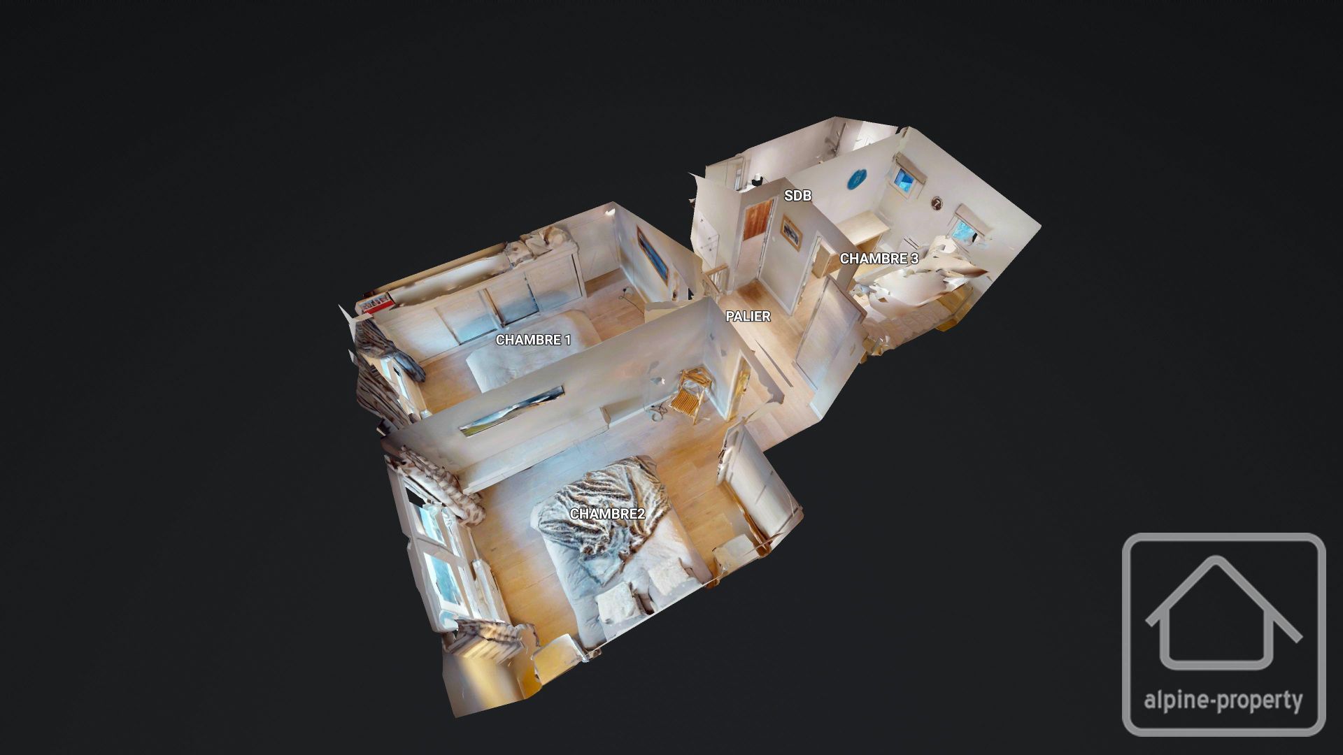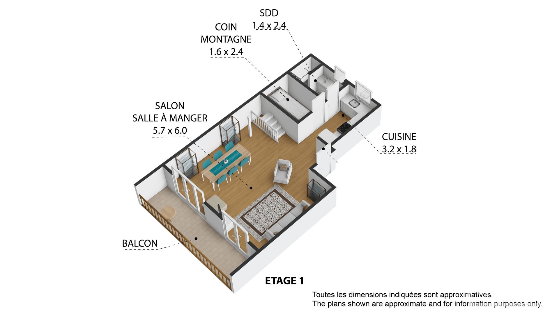 • Main level: A modern fully equipped kitchen open to a warm living area that opens onto a balcony to enjoy the panorama, a mountain sleeping area, and a shower room with WC complete this level.
