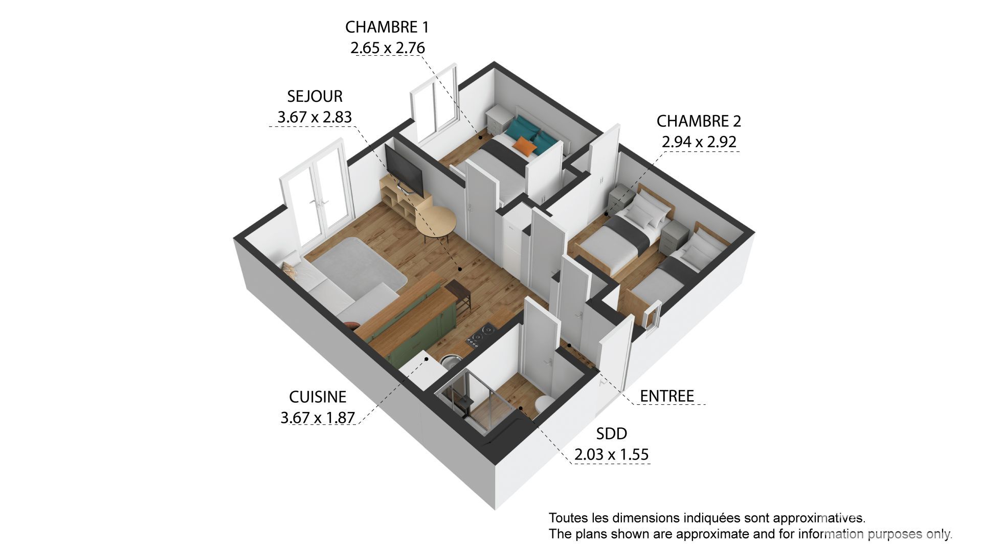 Layout: entrance, bathroom, storage and laundry area, fully equipped modern open-plan kitchen with dining and living area opening on to private terrace and garden with views of Mont Blanc. Two double bedrooms with built-in storage.