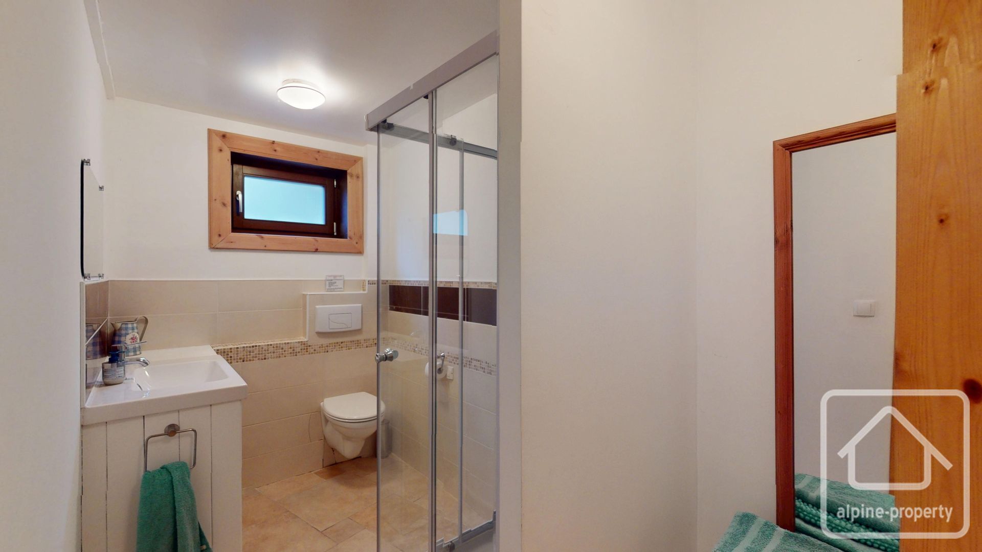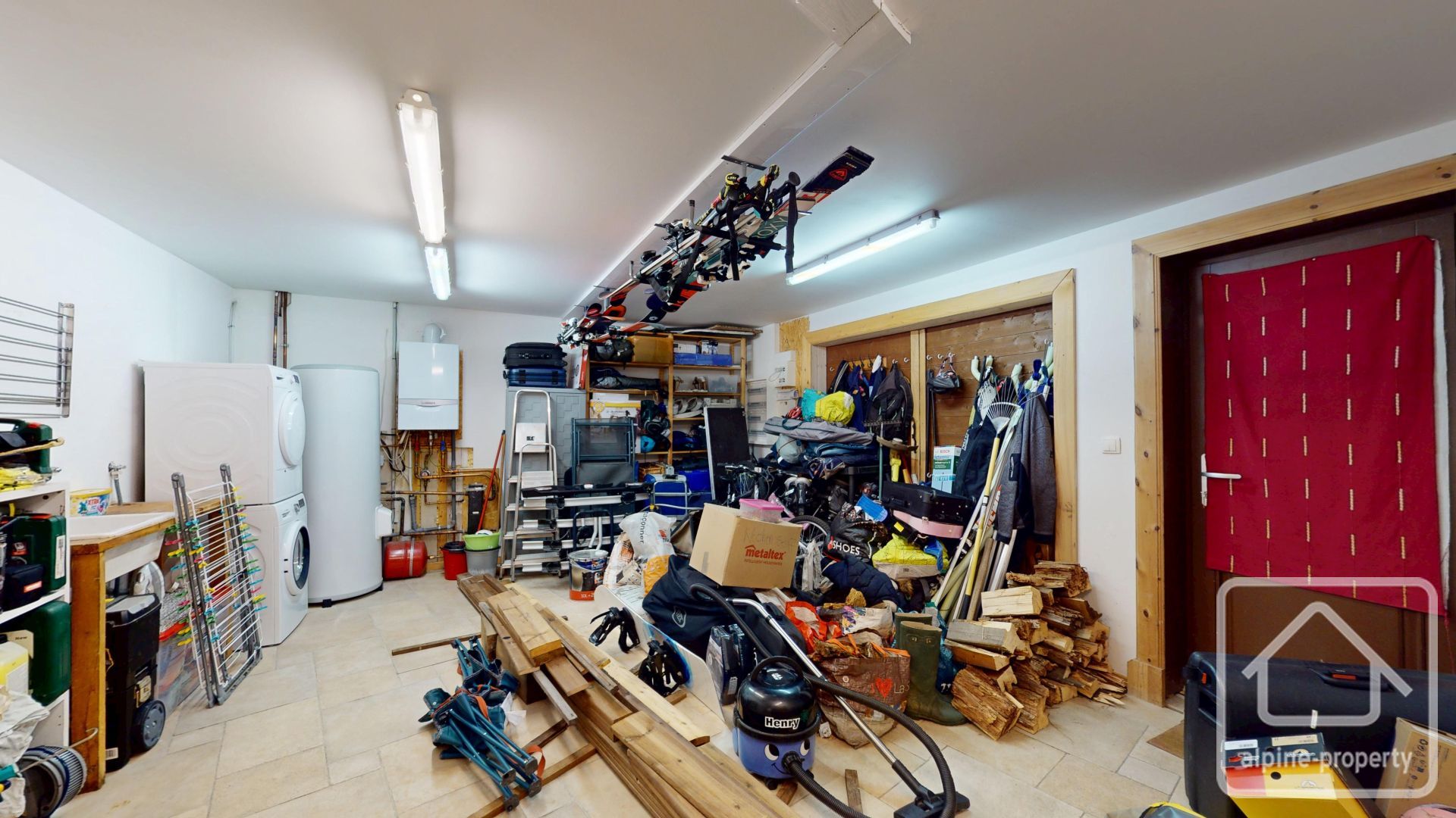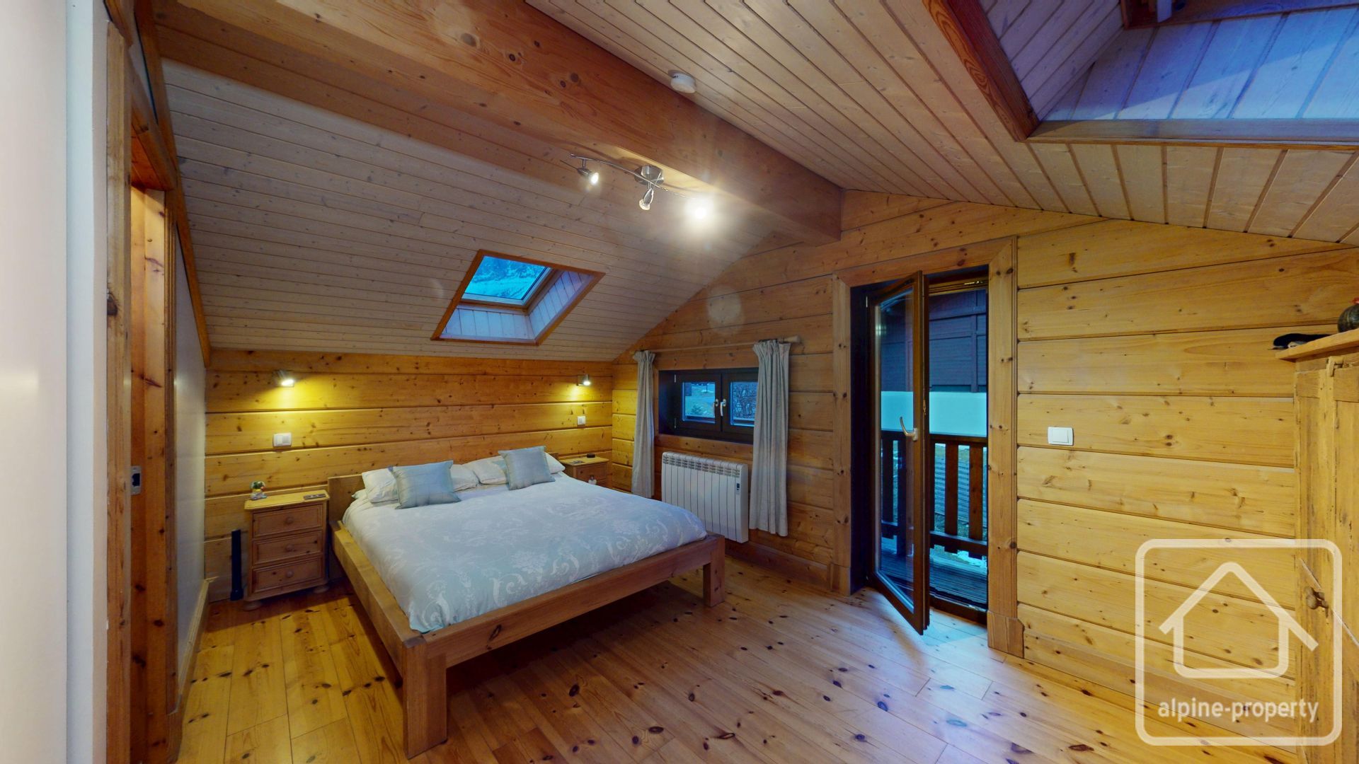 Garden level: entrance into second living room with south-facing balcony, guest WC, fully equipped open-plan kitchen onto dining area and cathedral height primary living room with multiple glass openings, views of the ski pistes, opening onto a large wooden terrace and private garden facing west. A wood burning stove was installed in 2025 for added ambiance on cosy winter nights.