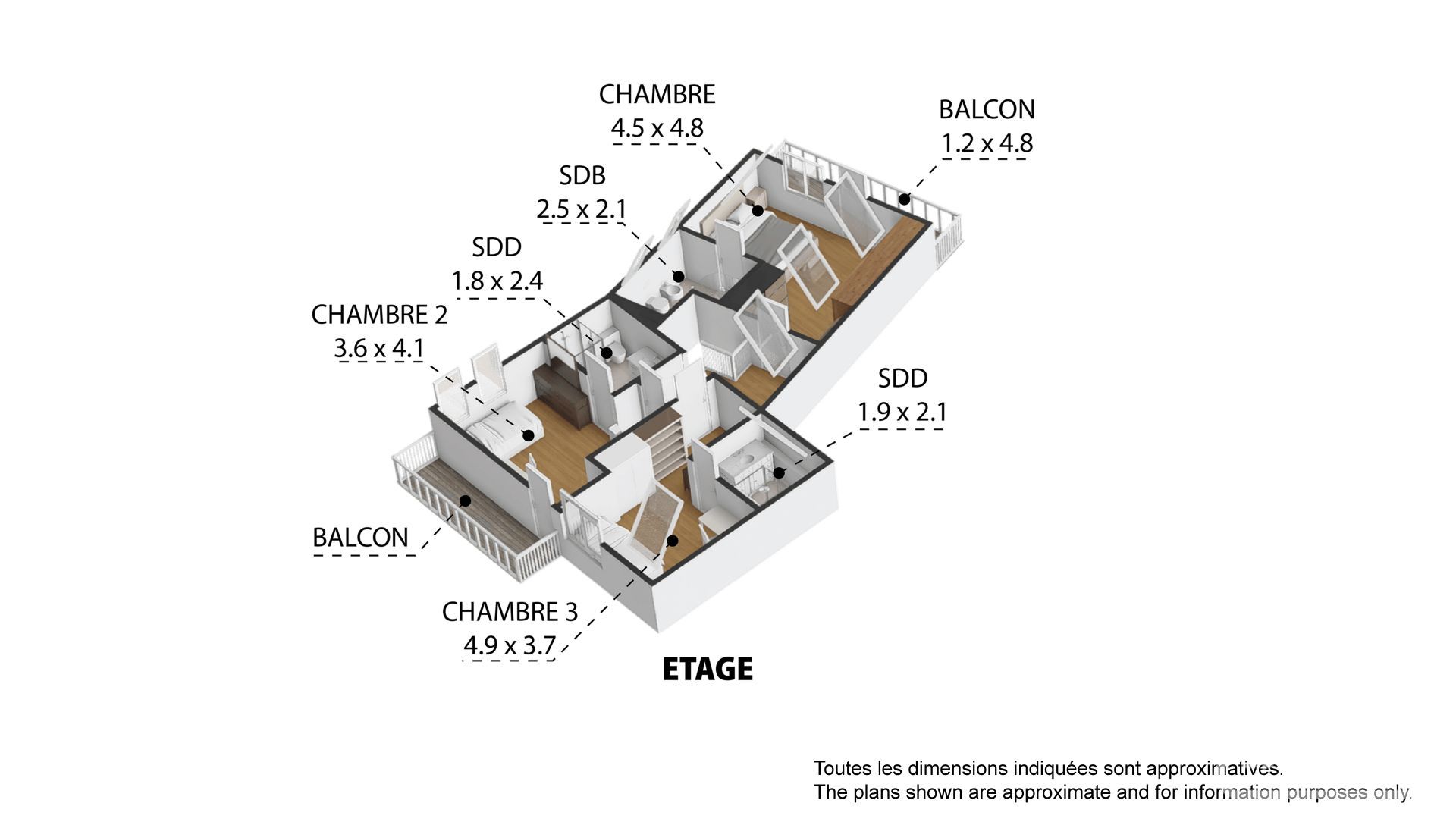 Upper level: south-facing master bedroom with balcony and ensuite with bath and shower, two further bedrooms with shower ensuites, one with north-west facing balcony.