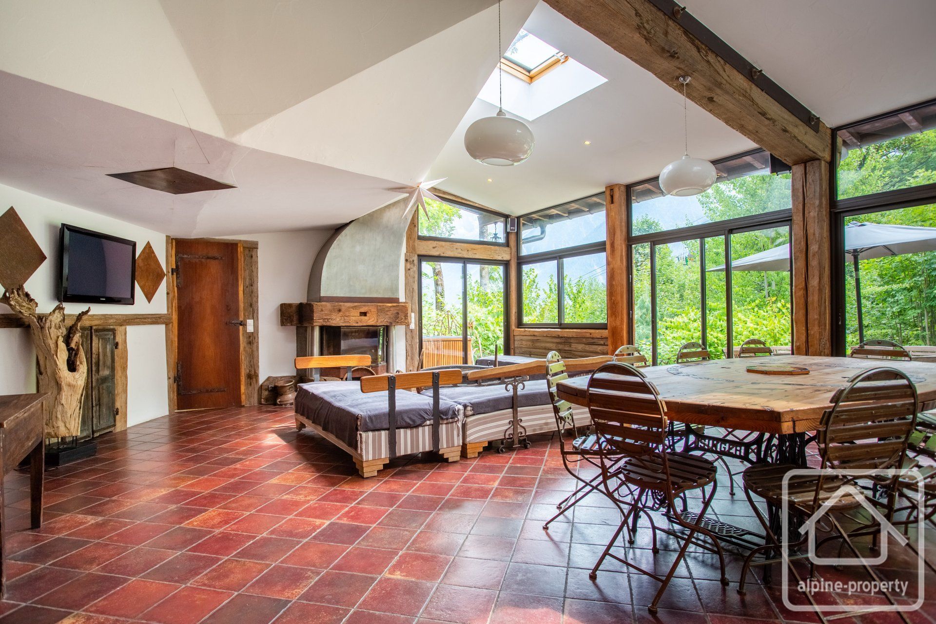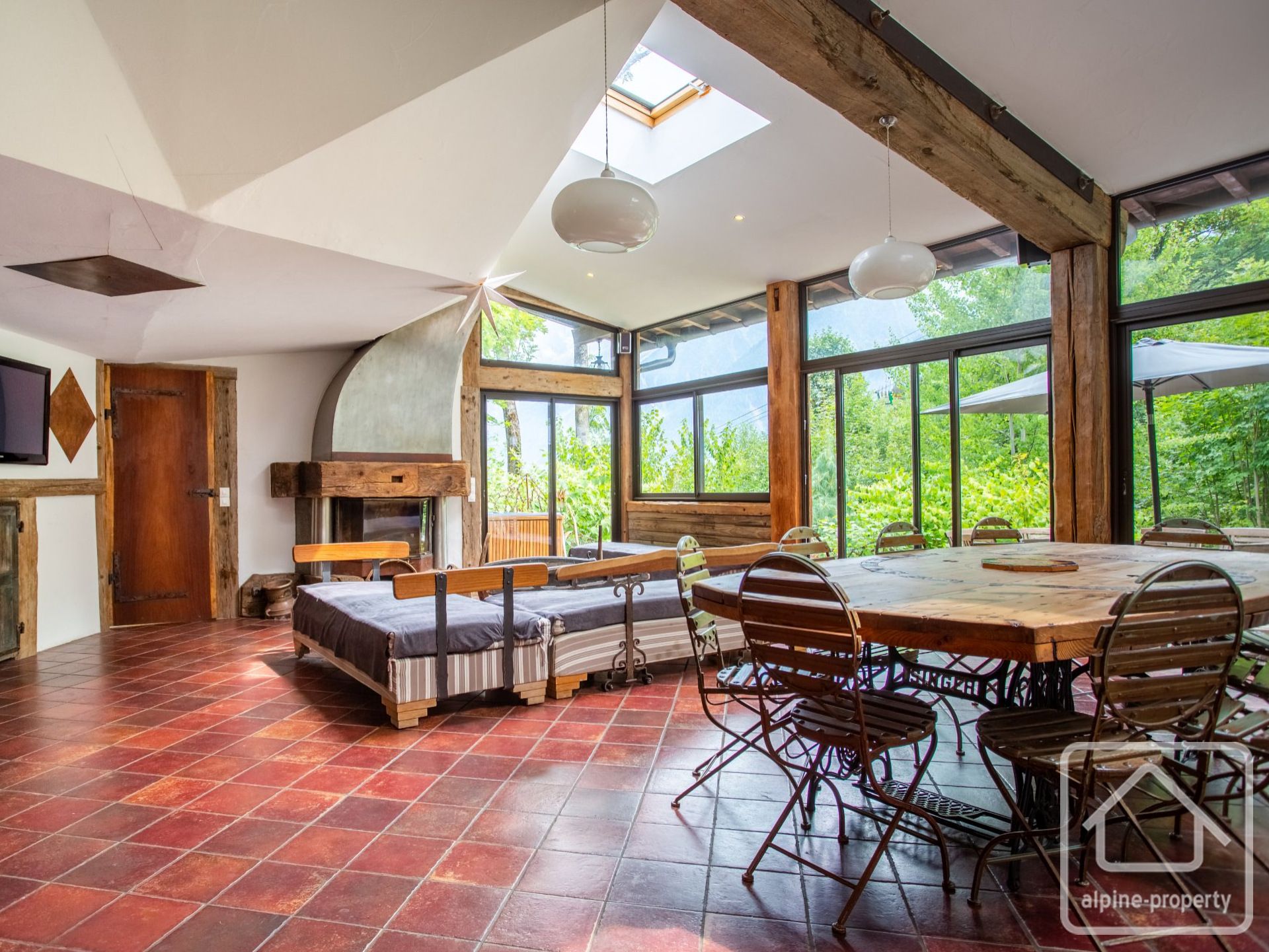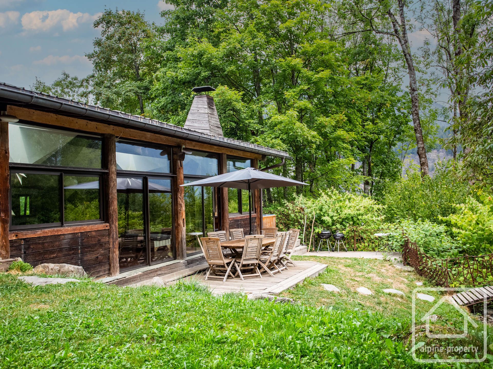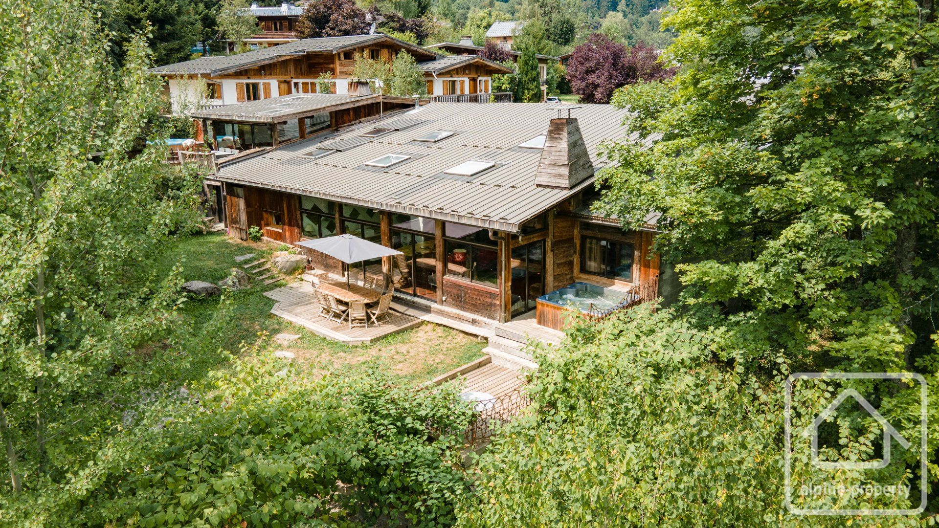 Each property has 5 bedrooms and multiple bathrooms, with glass patio doors opening on to the exquisite terraced garden with babbling brook and private bridge accessing the footpath to the Prarion ski lift and local transport. An additional terrace and private corner provides a private area for barbecues and/or a hot-tub, the perfect spot from which to watch the Prarion cable car passing over the trees at the edge of the garden.