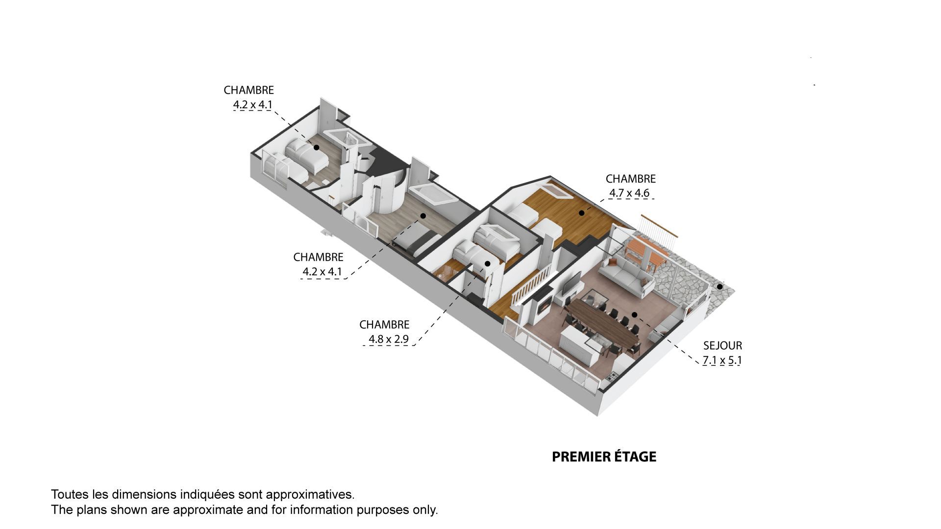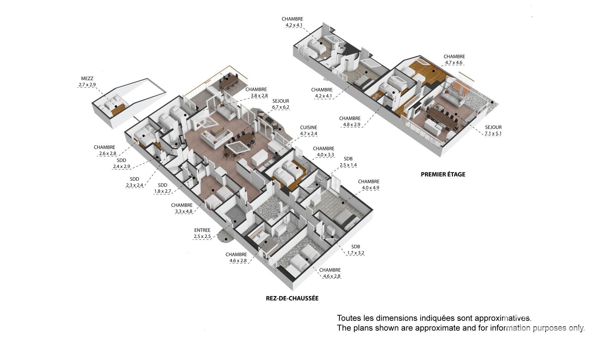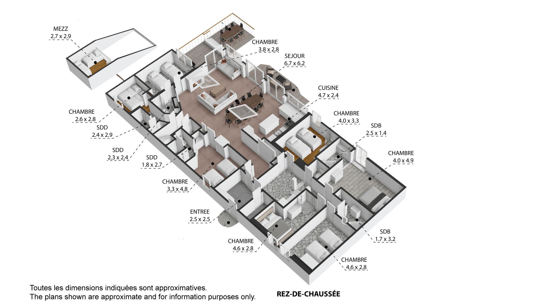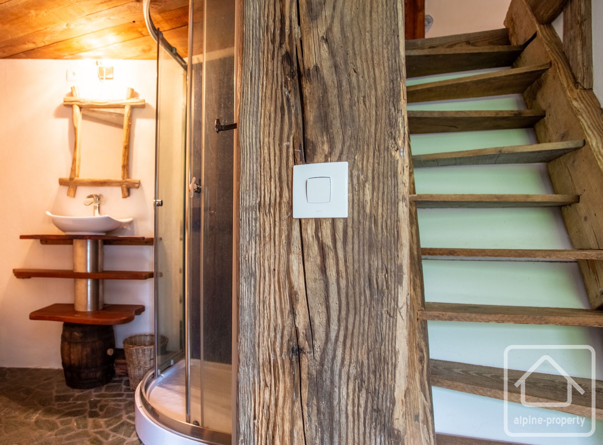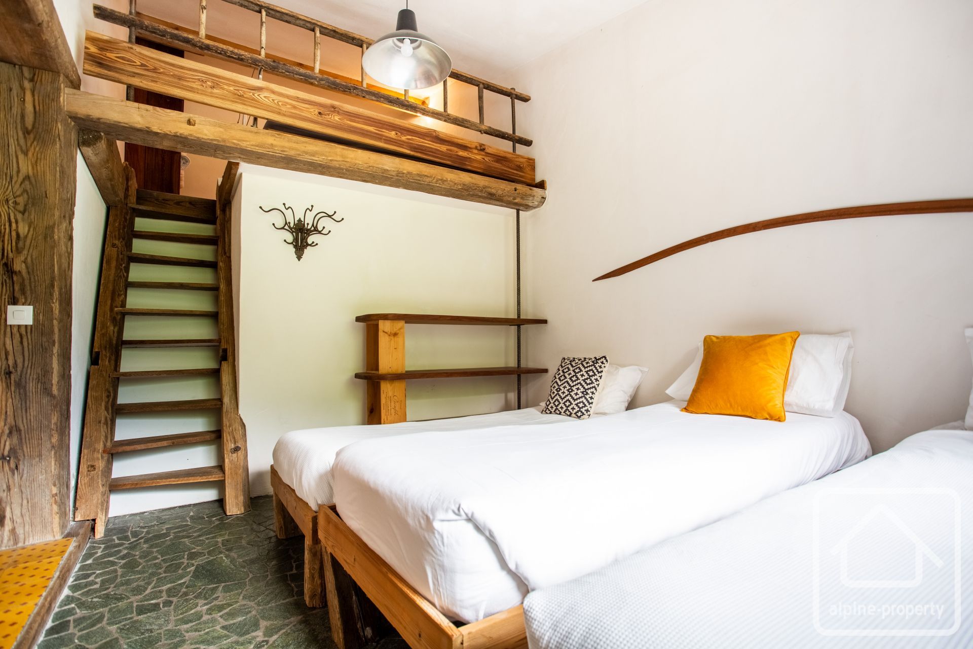Each property has 5 bedrooms and multiple bathrooms, with glass patio doors opening on to the exquisite terraced garden with babbling brook and private bridge accessing the footpath to the Prarion ski lift and local transport. An additional terrace and private corner provides a private area for barbecues and/or a hot-tub, the perfect spot from which to watch the Prarion cable car passing over the trees at the edge of the garden.