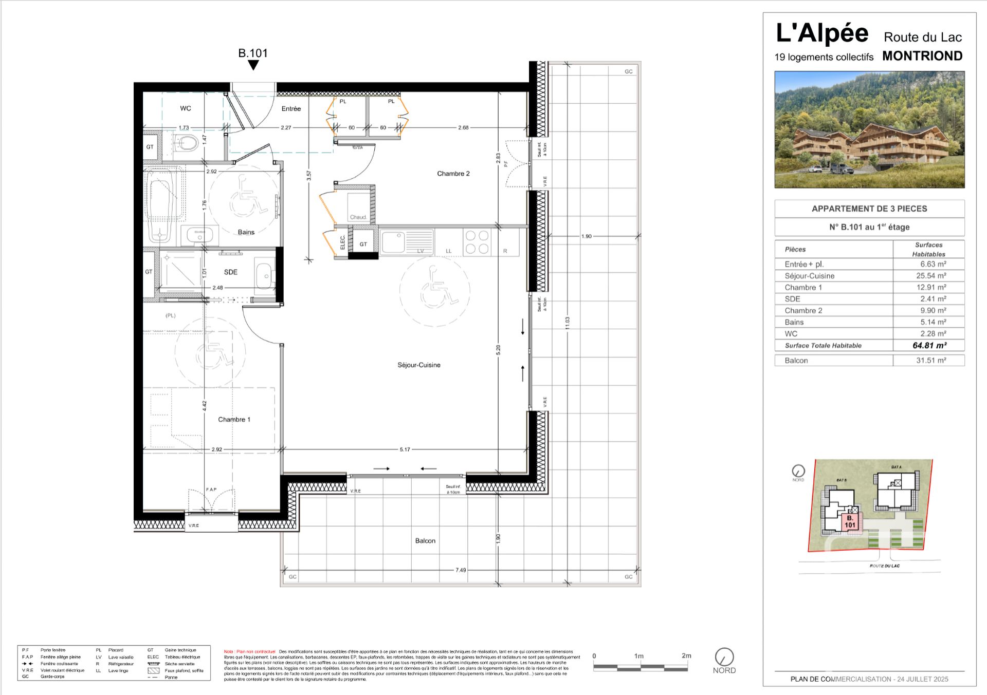 Appt B101 is located on the first floor of the residence. It has two bedrooms, one with en suite shower room and access onto the balcony, and there is a further bathroom with room for a bathtub, and a separate WC. The kitchen and living area is open plan and generously proportioned at 25.54m2, with a patio doors leading from the living area on to the superb wrap-around balcony of 31.5m2. The total surface area of the apartment is 64.81m2.
