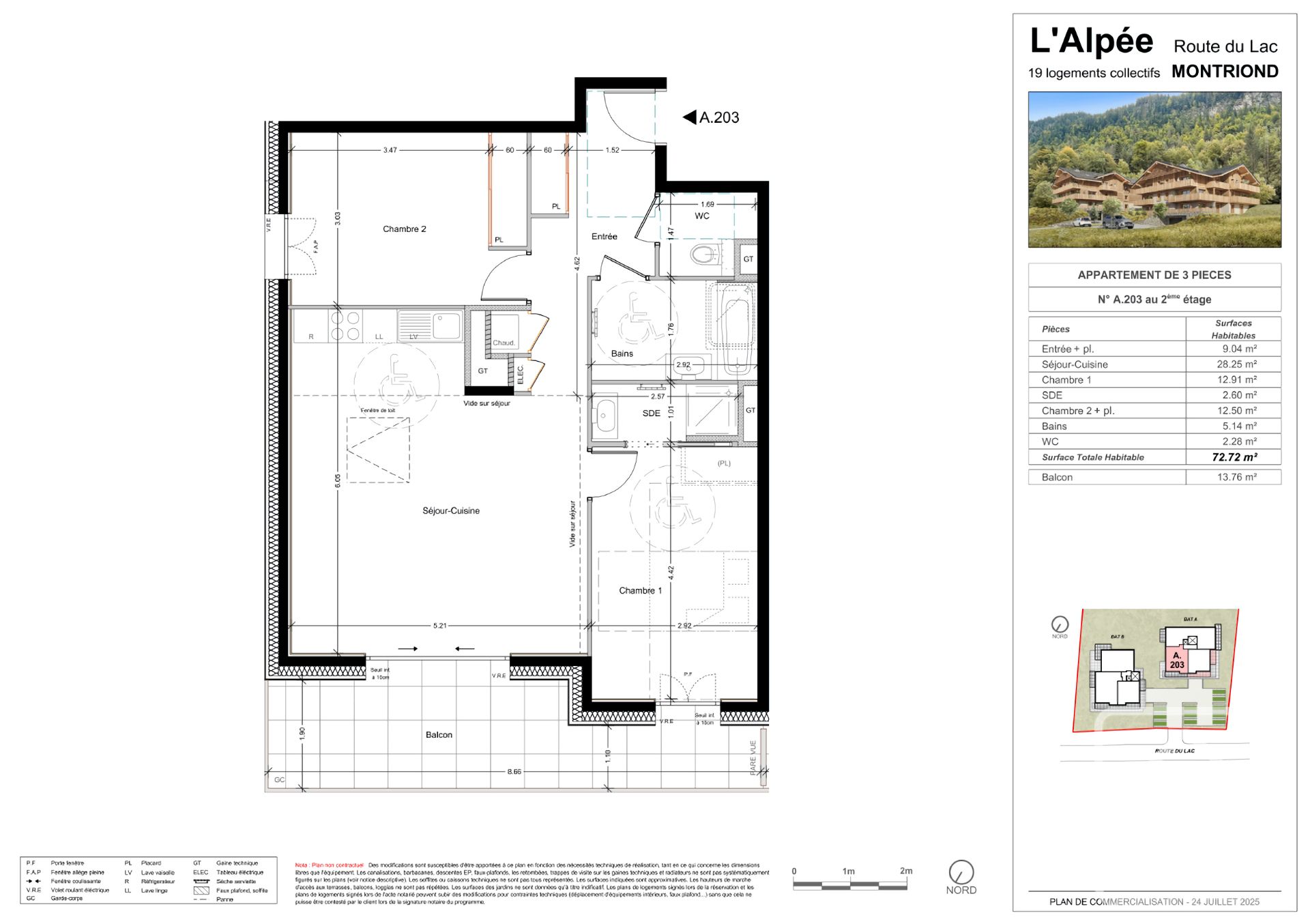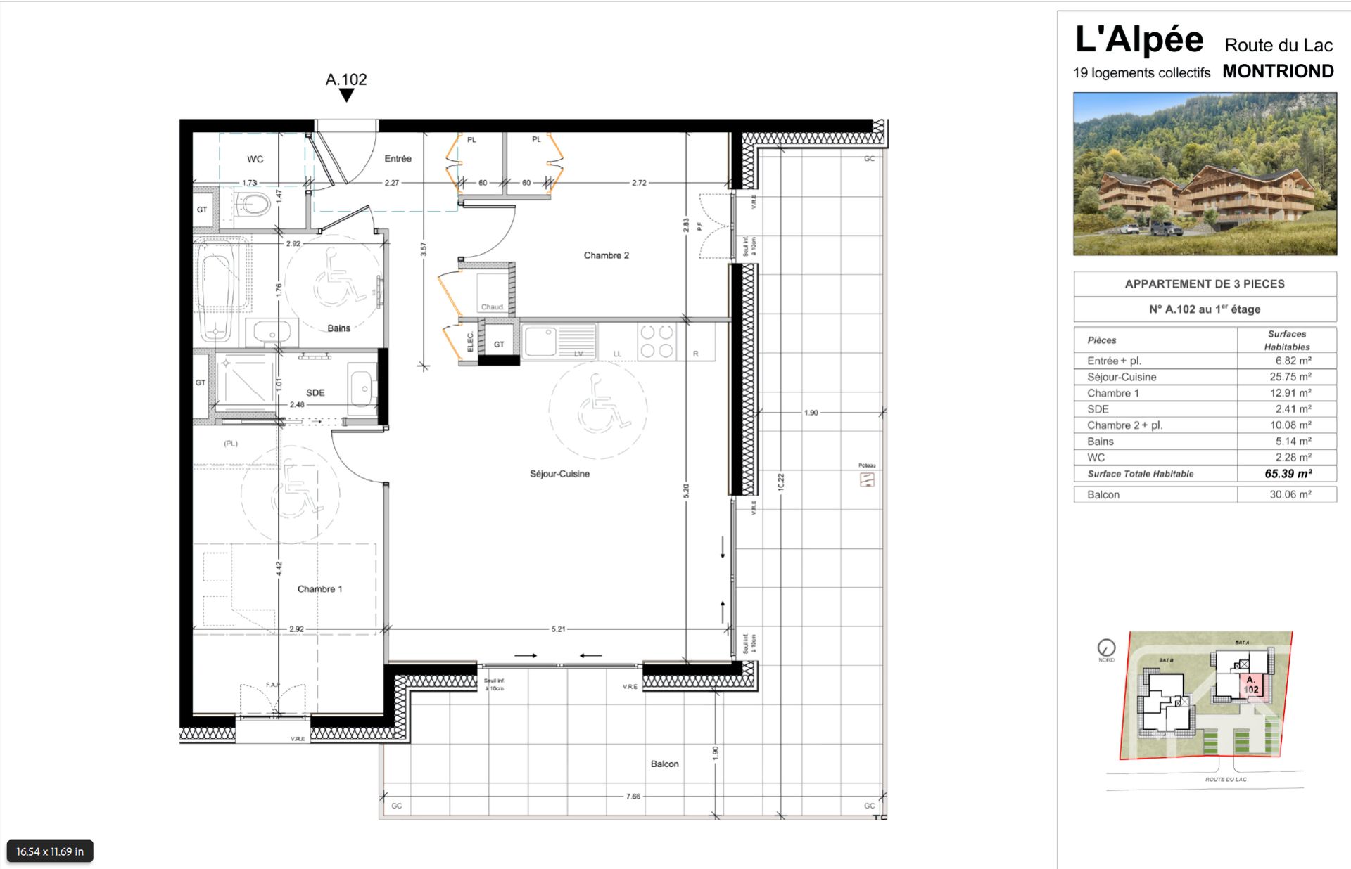 Appt A202 is a super duplex apartment located on the second floor of the residence. On the first floor of the apartment, the kitchen and living area is open plan and very spacious at 33.51m2, with access via patio doors to the balcony of almost 14m2, and a vaulted ceiling into the roof area. The first bedroom is also on this level, with access to a second balcony of 10m2, and there is also a bathroom and separate wc. Upstairs, the apartment has a large second bedroom, a generous ‘coin montagne’, and a second bathroom and separate wc. The total surface area of the apartment is 107.02m2.