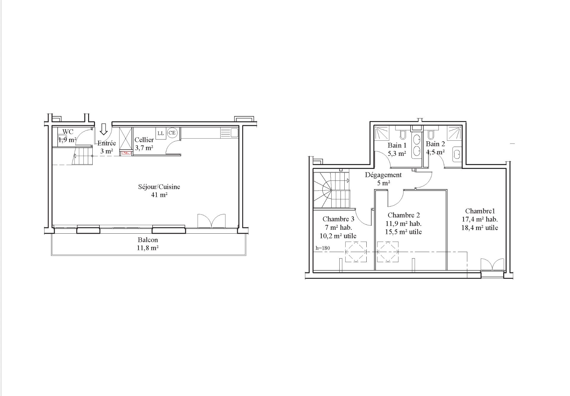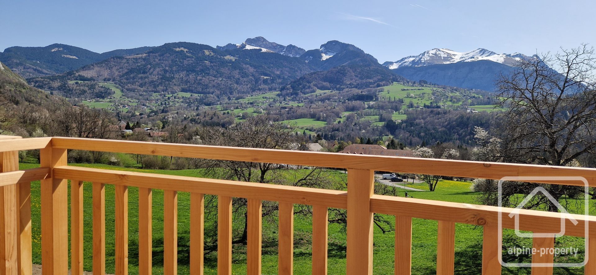 This bright second-floor duplex apartment features an east-facing balcony (11.80 m²) on the first level that enjoys morning sun and views of Mont Blanc, with east-facing windows providing natural light. The master bedroom includes an ensuite bathroom, with a second bathroom serving the other bedrooms.