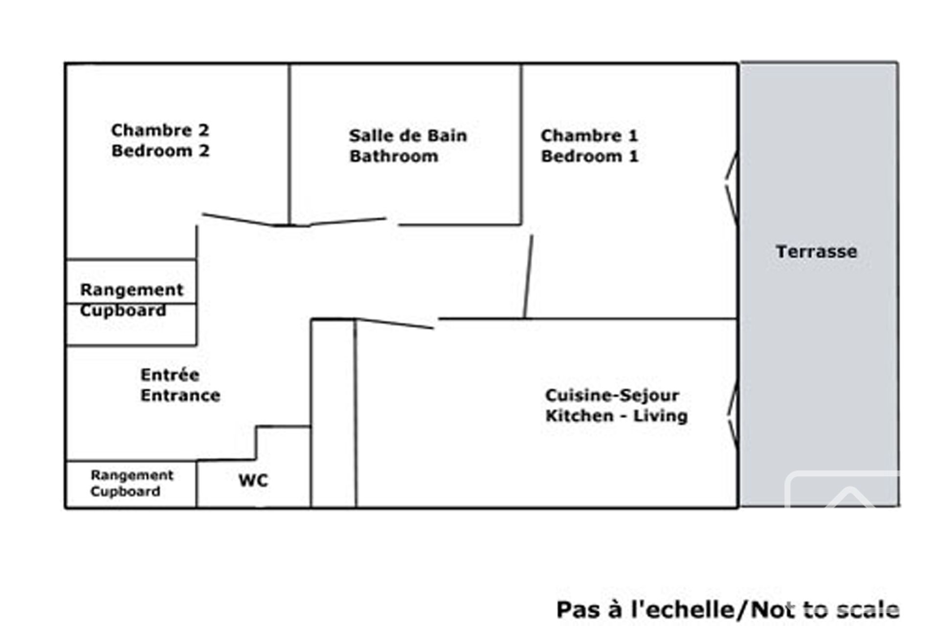 There is a master bedroom with access to the terrace/patio and a further second bedroom with fitted wardrobe and space for bunk beds.