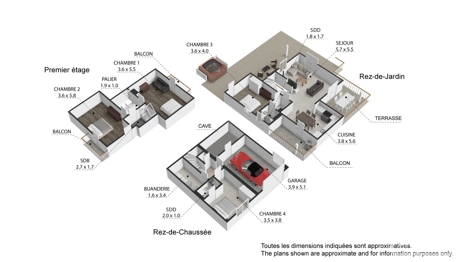 Upstairs, there are two additional bedrooms with a balcony each, and a bathroom.