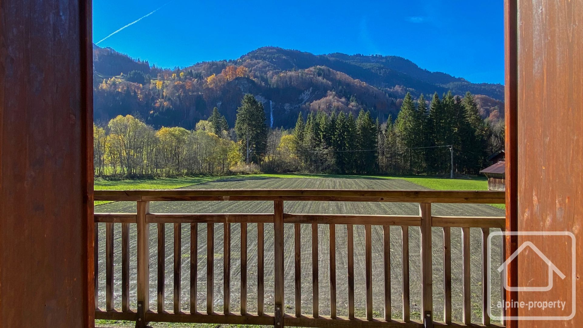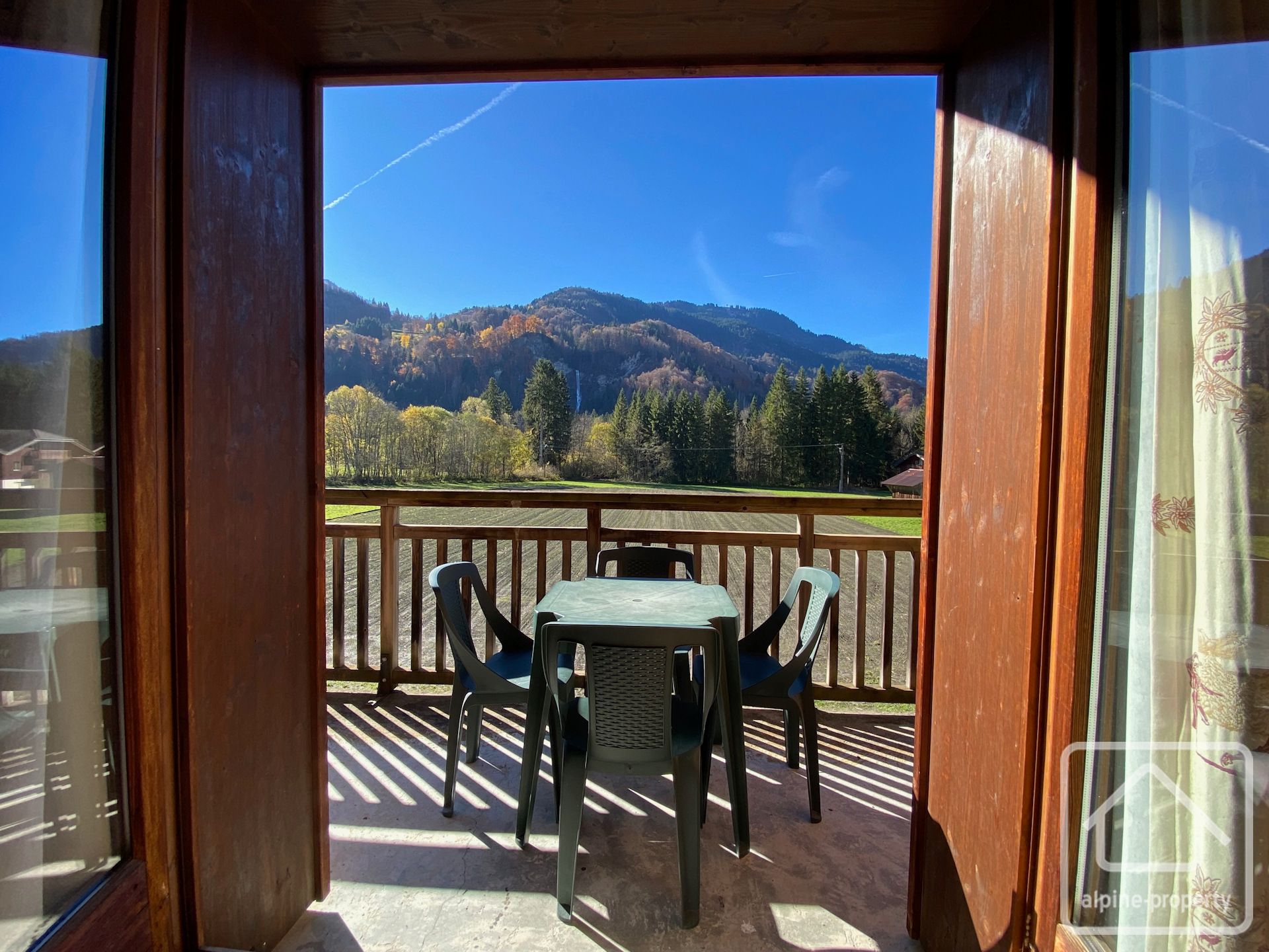 The apartment offers 44.95 m² of habitable space, a south-facing balcony off the living area with a superb view of the waterfall and non-constructible agricultural land in front, and is just an 8–10 minute walk from the centre of Samoëns, with the ski bus stopping right outside the residence.