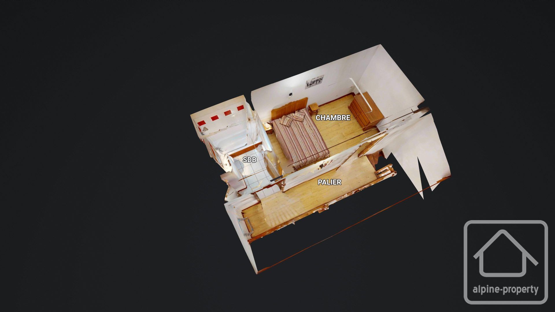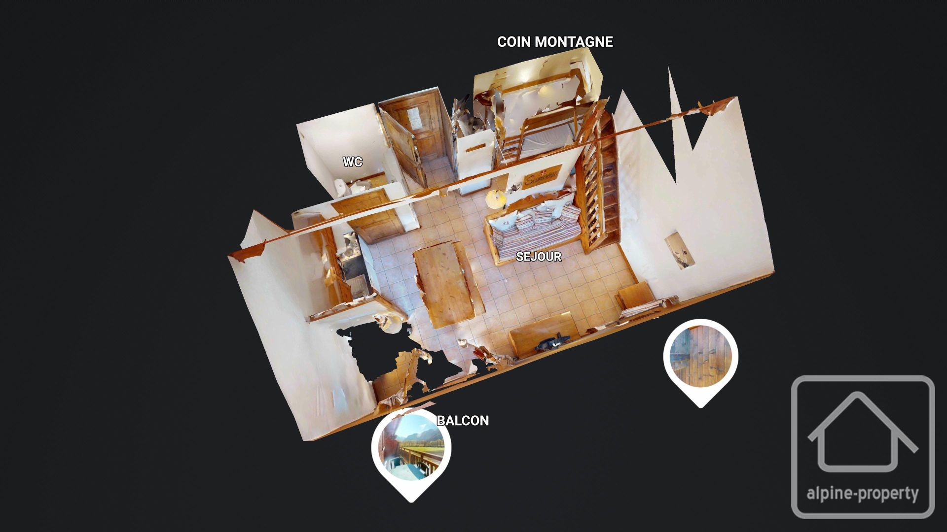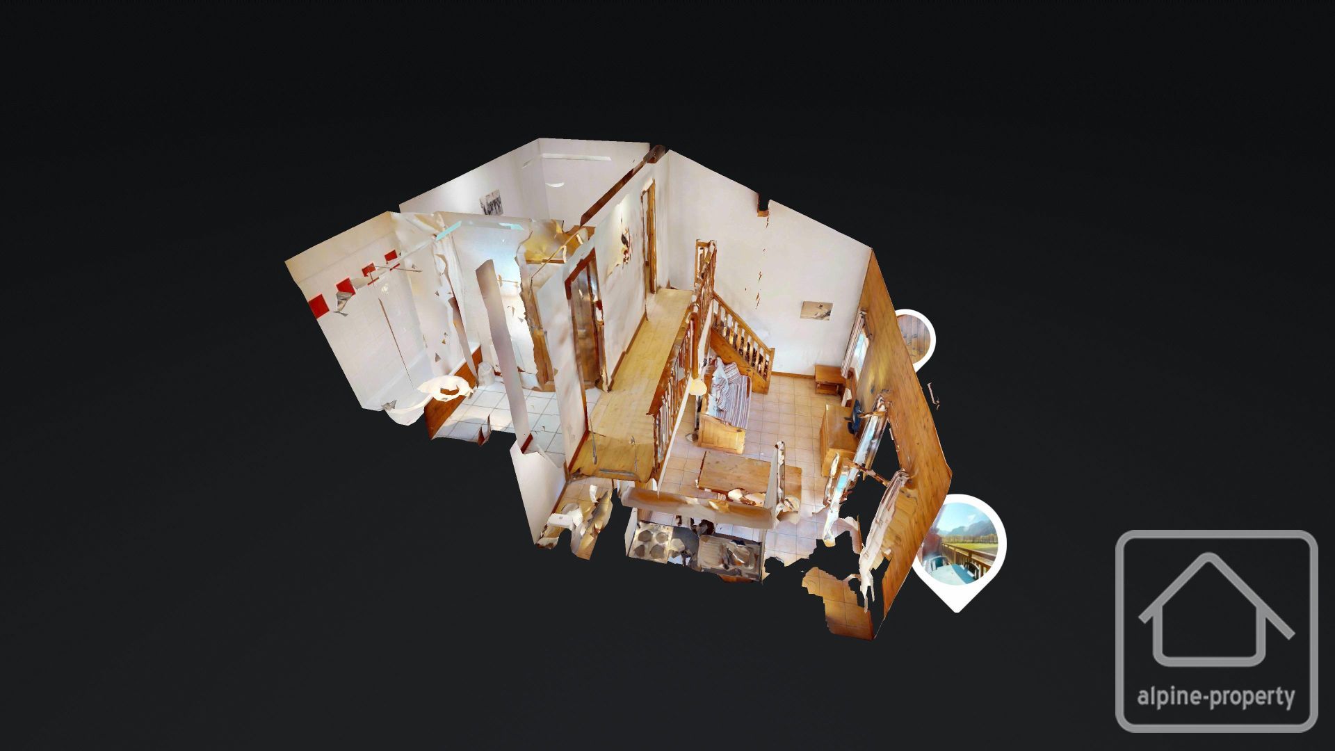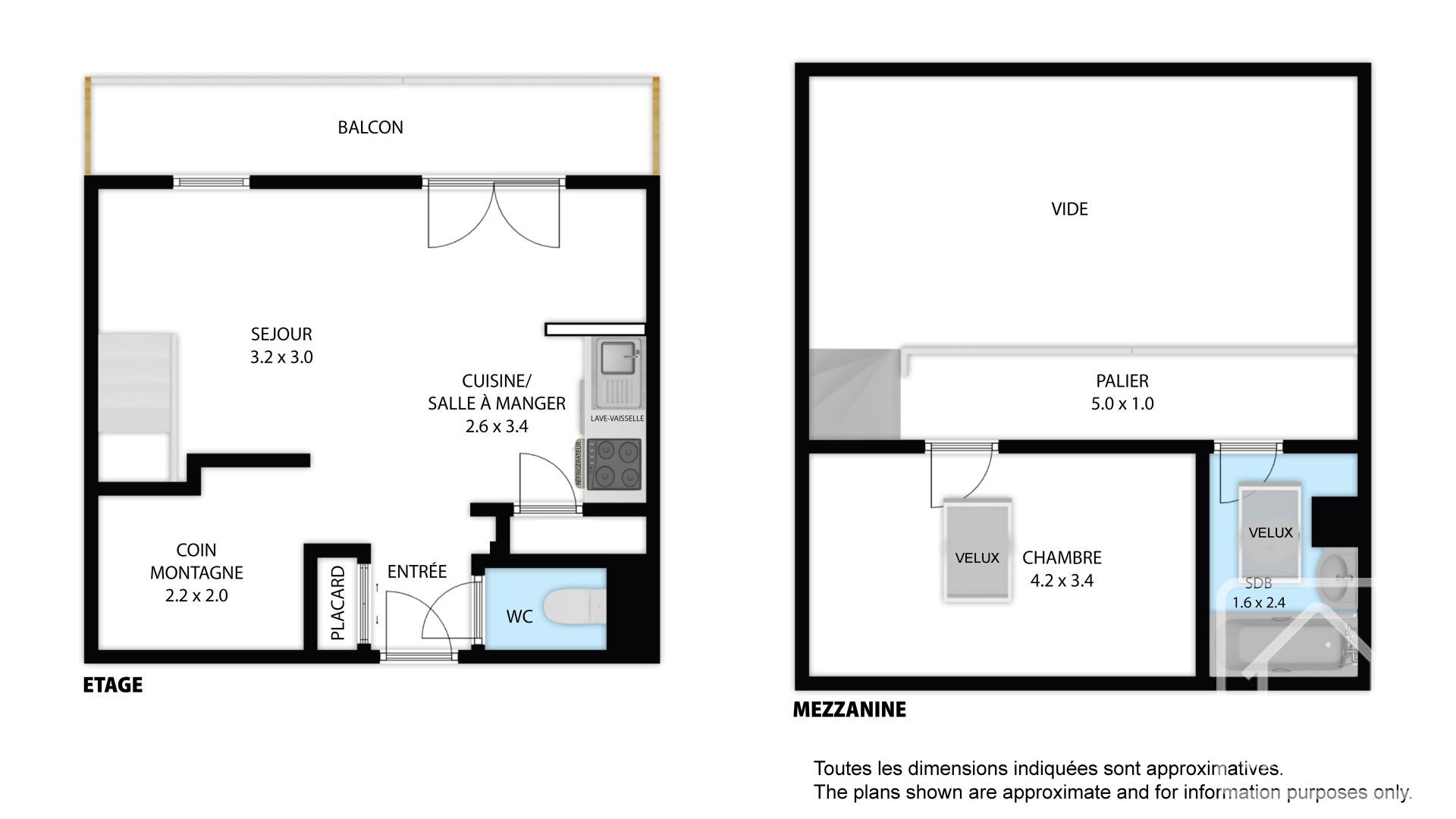 The accommodation comprises an entrance with a sleeping area, a living room with kitchenette and WC on the main level, and a bedroom, bathroom and mezzanine upstairs.