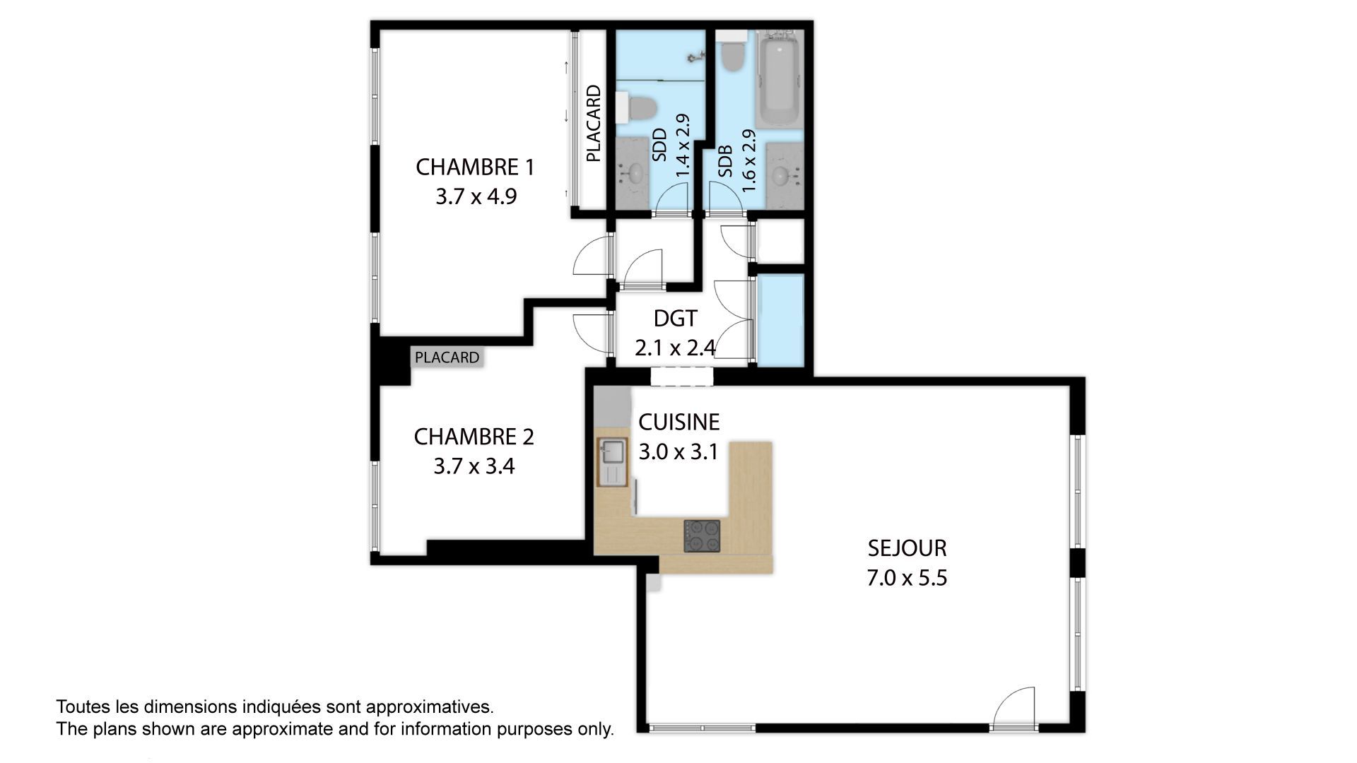 The apartment offers a generous and well-designed layout, comprising an entrance hall, a large and spacious living room with a fitted kitchen, two bedrooms with built-in cupboards, two bathrooms, and a hallway with integrated storage as well as a dedicated laundry cupboard. The living area is particularly impressive, providing a bright and welcoming space, ideal for relaxing or entertaining.