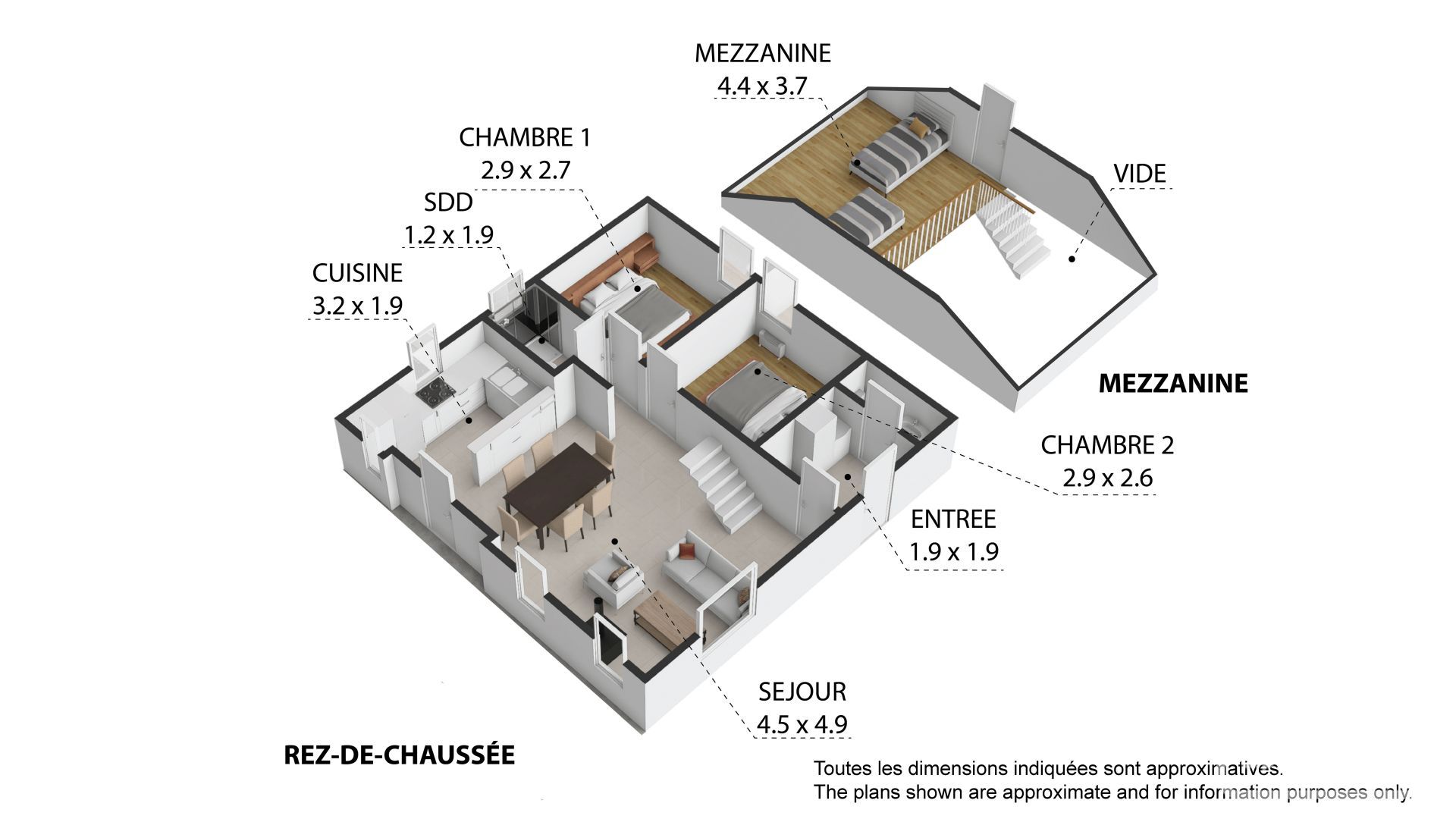 Accommodation comprises: an entrance with cloakroom, an open kitchen, two cosy bedrooms, a family shower room, a mezzanine of about 17 m² (measured under 1.80 m) as well as roughly 10 m² of attic storage (also under 1.80 m)