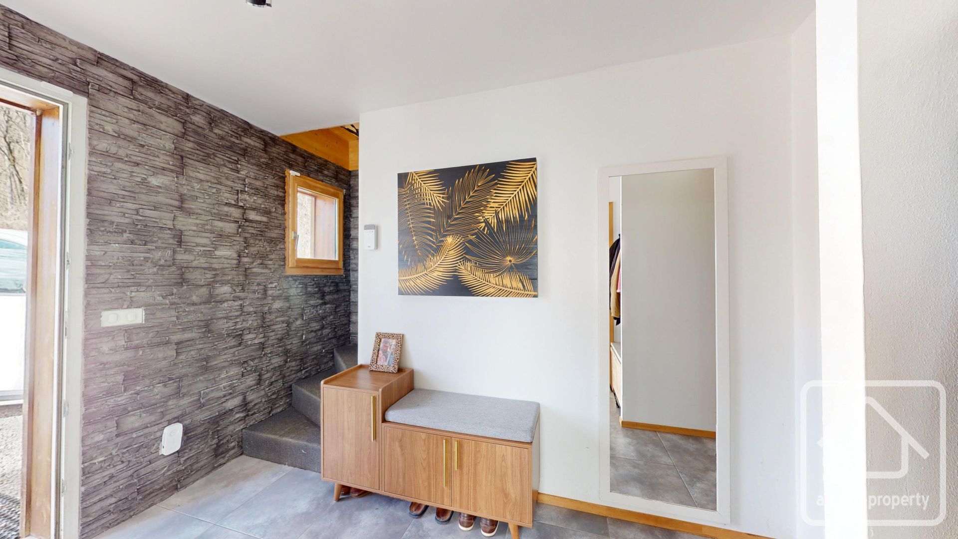 On the garden level you’ll find the entrance with storage and a central vacuum, a shower room with WC, an open-plan kitchen and living area with terrace access, a cabin bedroom (currently used for storage), a modest garage and a cellar/laundry room with a water softener.