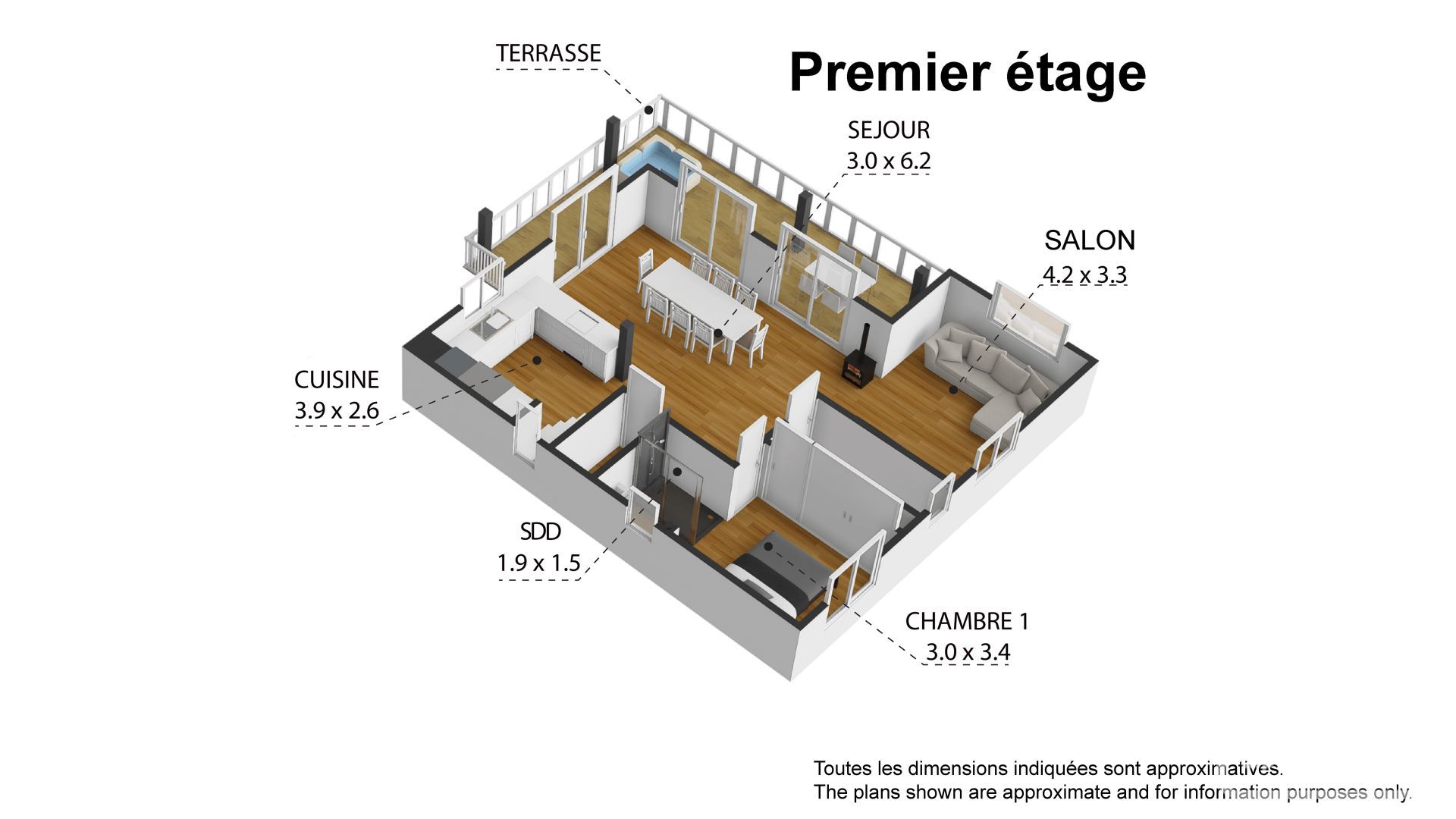 The first floor features an open-plan living area (with wood burner), kitchen and dining area that opens onto a generous east- and south-facing terrace, ideal for entertaining. It also includes a principal bedroom with a basin and shower and a separate guest WC. The upper floor contains three further bedrooms, a landing and a family bathroom.